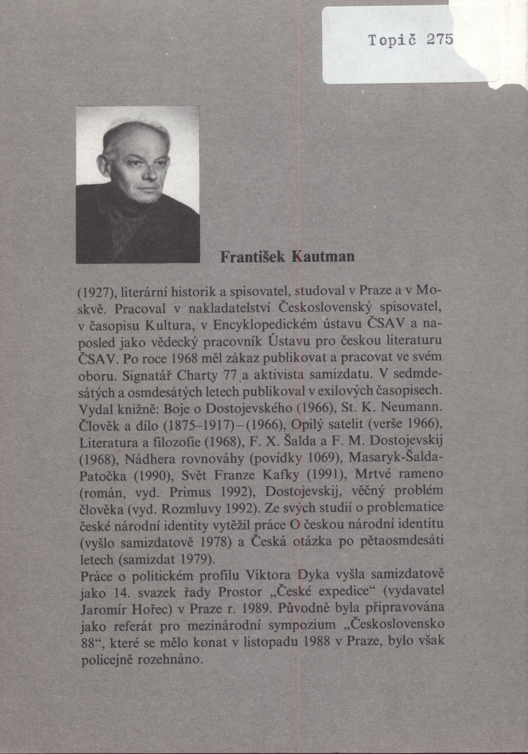 Druh dok. monografie Osobní hesla Dyk, Viktor, 1877-1931 - novinář, politik, spisovatel, dramatik, překladatel Klíčová slova český nacionalismus * český národ * česká společnost * Dyk V. * články MDT 323.1 * 329.7 * 943.7 Uživatelské pole PNP Sign. Topič 0275 dedikace (modře, perem): "Paní profesorce Dr. Miladě Blekastadové František Kautman, červen 1993". Sign. JVladislav 628 - dedikace ''Janu Vladislavovi František Kautman 9.3.93'' Signatura Přír.číslo Lokace Info M 219 c 65 00932/93-k Sbírka Topič 0275 1838/2014 Sbírka JVladislav 628 2322/2022 Sbírka