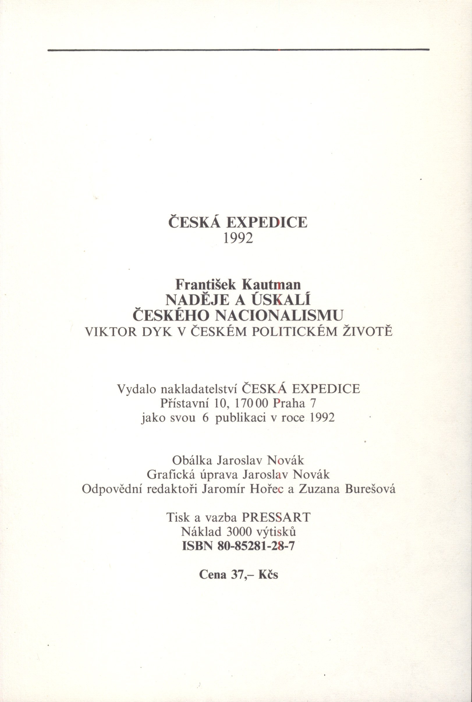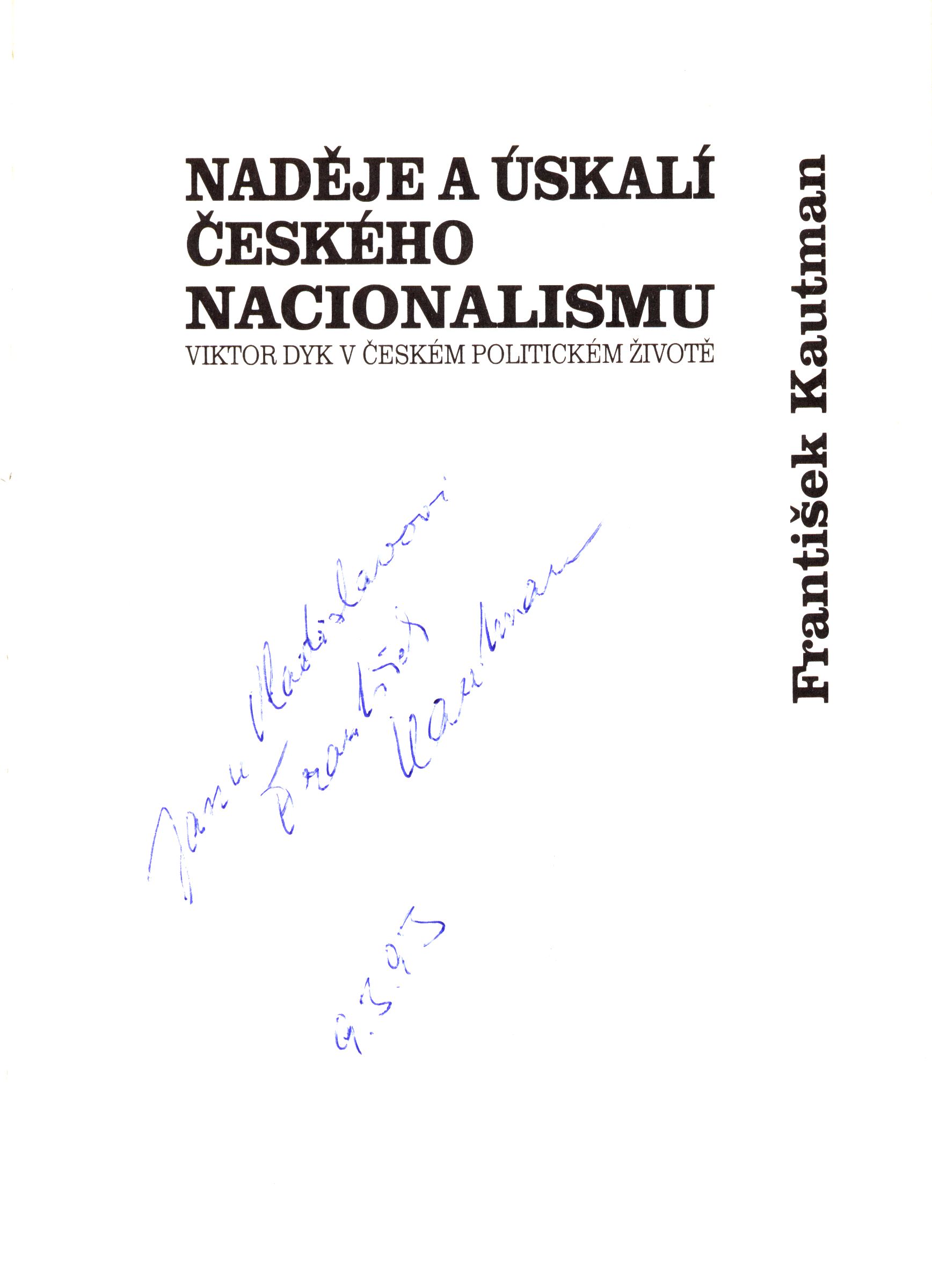 Názvové údaje Naděje a úskalí českého nacionalismu : Viktor Dyk v českém politickém životě / František Kautman ; obálka a grafická úprava Jaroslav Novák Osobní jméno Kautman, František, 1927-2016 (Autor) (Dedikátor) Další autoři Hořec, Jaromír, 1921-2009 (Autor) Novák, Jaroslav, 1919-2003 (Autor obálky) (Knižní grafik) Vladislav, Jan, 1923-2009 (Dedikant) Korp. Česká expedice (nakladatelství : 1979–2007) (Nakladatel, vydavatel) Pressart (tiskárna) (Tiskař) Další var.názvy Viktor Dyk v českém politickém životě Nakladatel Praha : Česká expedice, 1992 Výrobce [Ostrava] : Pressart Rozsah 101 stran : ilustrace ; 21 cm ISBN 80-85281-28-7 (brožováno) Země vyd. Česko Jazyk dok. čeština Poznámky Zdobená obálka. - Frontispis.- Titulní list. - Ediční poznámka. - Obsah. - Tiráž. - Na zadní straně obálky foto autora a poznámka o něm.