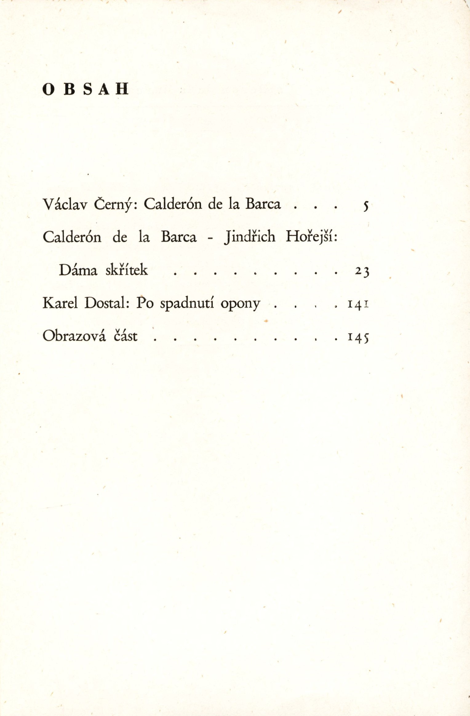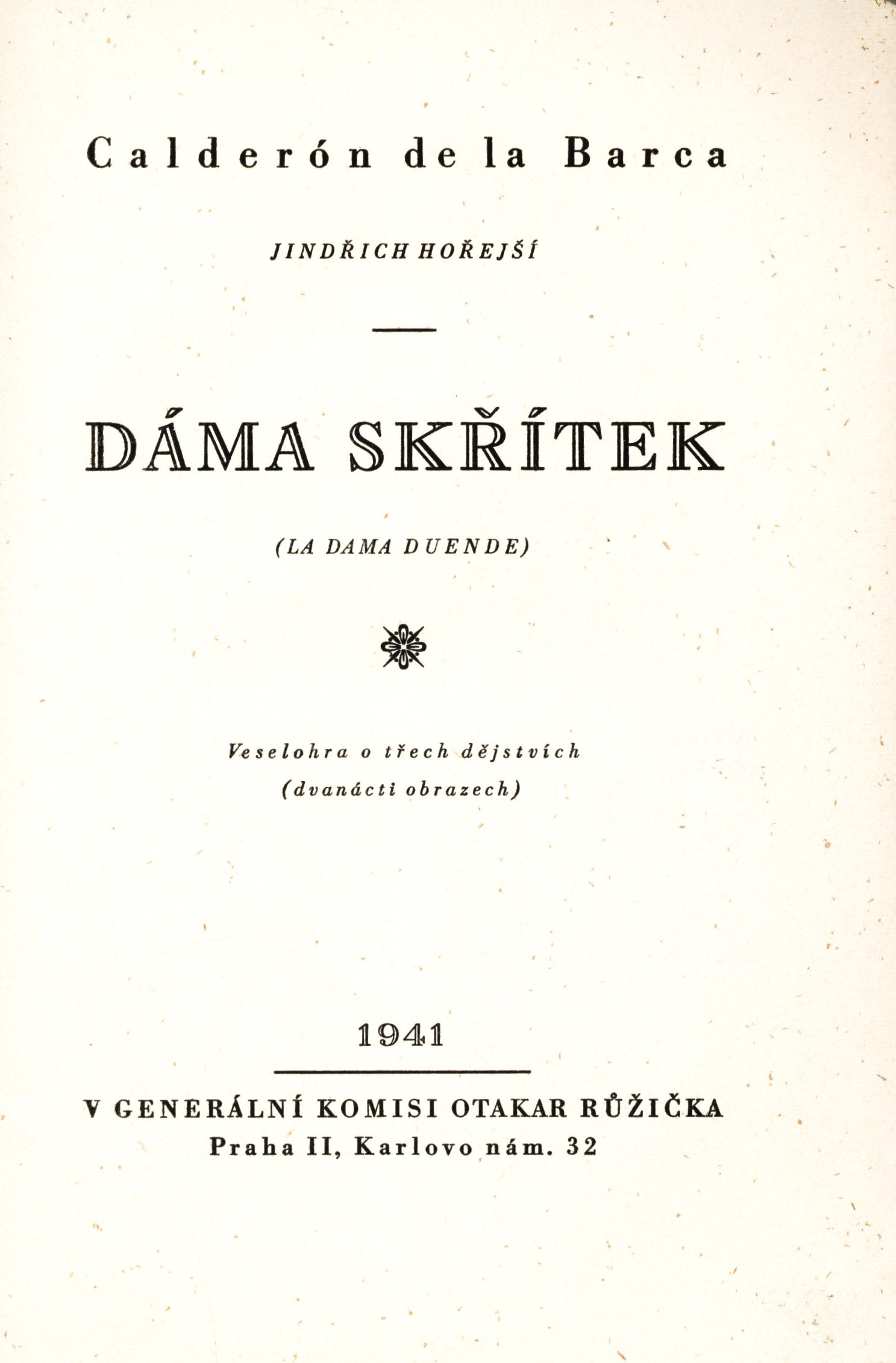1. Názvové údajeDáma skřítek : (La dama duende) ; Veselohra o třech dějstvích (dvanácti obrazech) / Calderón de la Barca ; Přebásnil Jidřich Hořejší ; Obálka a typografická úprava jsou provedeny podle návrhu Stanislava Kohouta ; Šest příloh fotografoval Josef Heinrich