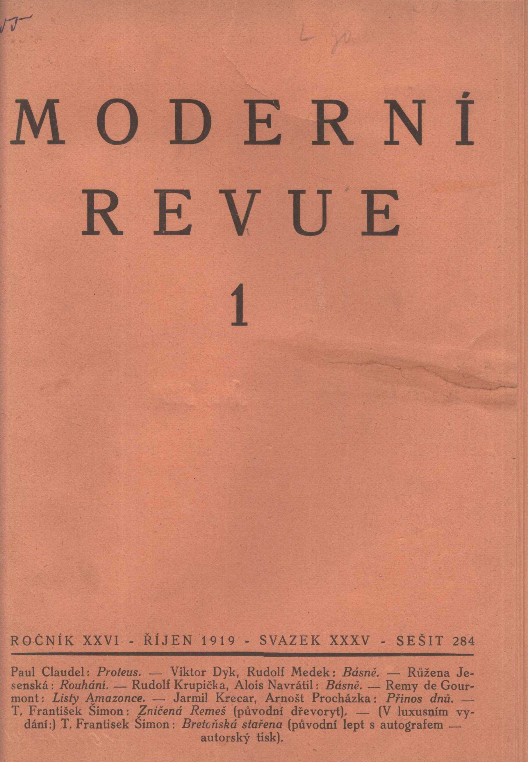 Citace Lexikon české literatury 3./I, s. 301-309. Moderní revue 1894-1925 (sborník), Praha 1995 Anotace Dvacátý šestý ročník (současně třicátý pátý svazek) významného modernistického časopisu redigovaného a vydávaného Arnoštem Procházkou. Obsahoval vedle rozsáhlejších prací na pokračování (např. drama Paula Claudela Proteus, soubor esejí Rémyho de Gourmont Listy Amazonce nebo próza Jiřího Karáska ze Lvovic Sen Luitgardin) domácí i překladové básně a kratší prózy. Vedle toho zde vycházely kritiky literární i společenské situace, které psali mj. Arnošt Procházka, Jarmil Krecar a Florian Drápal, a výtvarné a hudební úvahy (např. od Františka Koblihy a Kamila Fialy). Každé číslo bylo vyzdobeno otiskem původní grafiky a přednostní exempláře navíc originálním, signovaným grafickým listem. - (kkper) Druh dok. PERIODIKA - Svázaný ročník periodika Periodicita 1x měsíčně Poznámky o skryté bibliografii a rejstřících Obsahuje bibliografické údaje: seznamy došlých publikací. Nadřízená jednotka Moderní revue pro literaturu, umění a život Klíčová slova česká literatura * dekadence * česká dekadence * francouzská literatura * francouzská próza * symbolismus * drama * poezie * próza * próza formou dopisů * kritika * literární kritika * výtvarná kritika * hudební kritika * divadelní kritika * první republika * politika * české divadlo * české drama * české dramatické umění * literární život * umění * česko-německé vztahy * česko-německé soužití * r. 1919-1920 * umělecká revue * české časopisy MDT 821.162.3 * 821.162.3-92 * 821.133.1 * 821.133.1-3 * 7.036.45 * 82-2 * 82-1 * 82-3 * 82-95 * 070.447 * 82.09 * 7.072.3 * 32 * 821.162.3-2 * 7 * (437.3):(430) Uživatelské pole PNP Signatura KaG VI A 1/XXVI: Nepřednostní varianta. - Kompletní svázaný ročník s obálkami v zachovalém stavu. - Pozdější převazba (PNP), černá celoplátěná vazba se zlaceným hřbetním nápisem. - U čísla 9 vevázán reklamní prospekt na časopis Knihomol (4 s.). Sign. Q42 B29: černá polokožená vazba kombinovaná s plátnem, se čtyřmi vazy a zlaceným hřbetním názvem (Book Service - Vítovec, 2005); kompletní ročník včetně obsahu, obálky vevázány na konci svazku