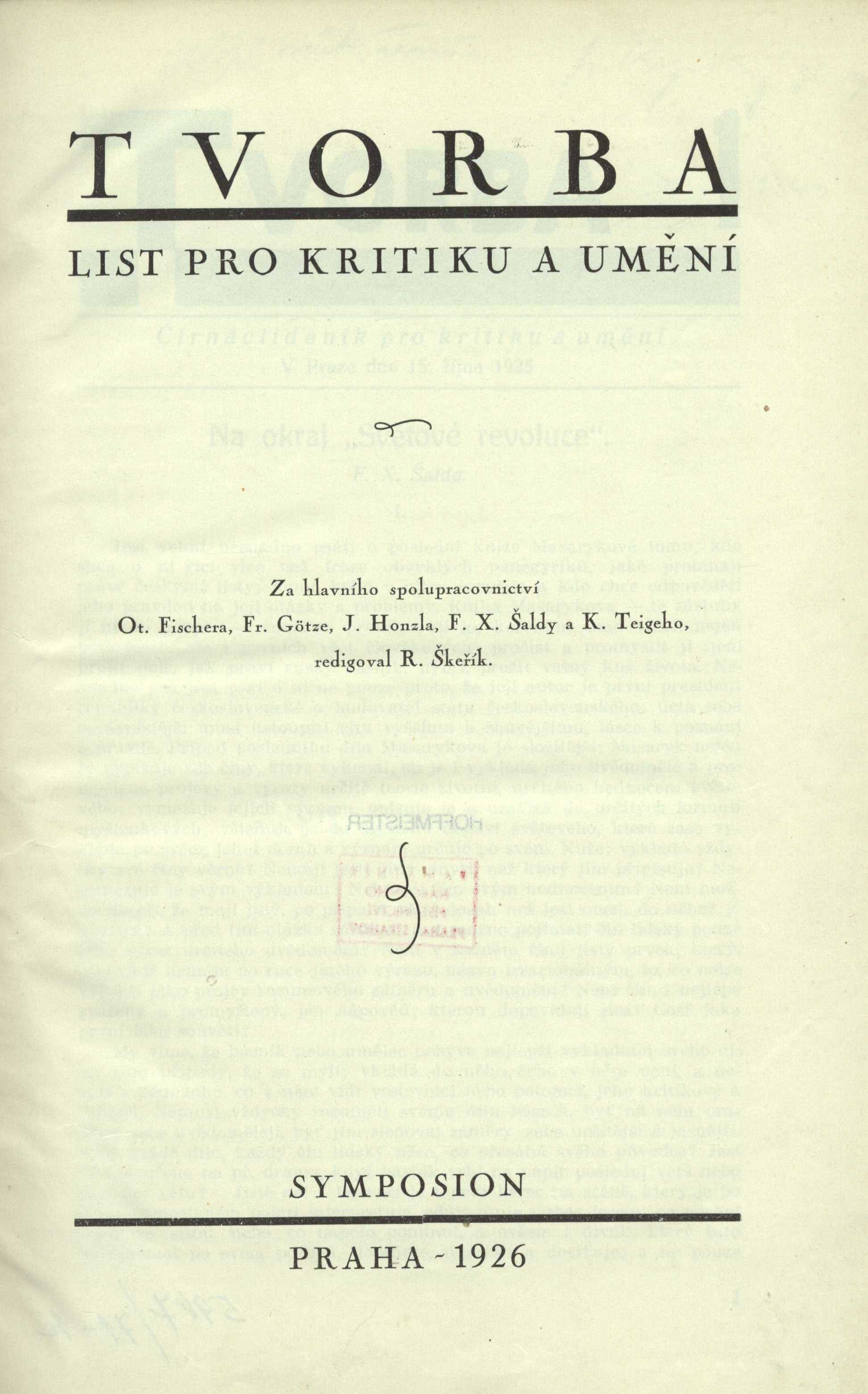 Názvové údaje Tvorba : list pro kritiku a umění Další autoři Škeřík, Rudolf, 1896-1968 (Redaktor, výkonný redaktor) Korp. Symposion (nakladatelství) (Nakladatel, vydavatel) Roč., číslo Ročník 1, číslo 1-13, 1925/1926 Nakladatel Praha : Symposion, 1925-1926 Rozsah 249 stran : ilustrace ; 28 cm ISSN 0139-5513 Země vyd. Česko Jazyk dok. čeština Poznámky Čb. karikatury. - V tiráži a v záhlaví podnázev: čtrnáctideník pro kritiku a umění