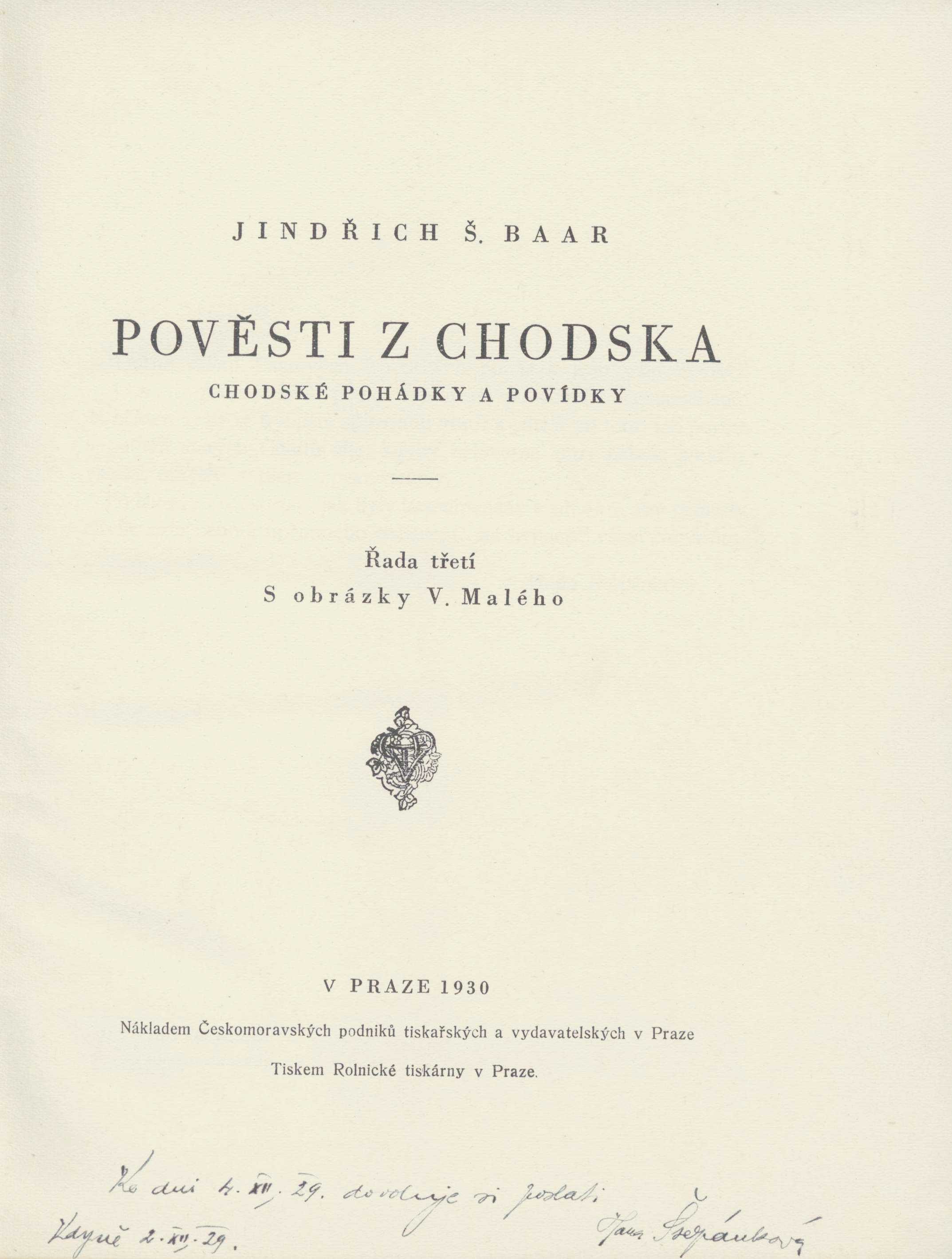 Názvové údaje Pověsti z Chodska : chodské pohádky a povídky. Řada třetí / Jindřich Š. Baar ; s obrázky V. Malého ; úvodní slovo napsala Hana Štěpánková Osobní jméno Baar, Jindřich Šimon, 1869-1925 (Autor) Další autoři Malý, Václav, 1874-1935 (Ilustrátor) Štěpánková, Hana, 1890-1950 (Autor úvodu atd.) Korp. Českomoravské podniky tiskařské a vydavatelské. 1908-1918 (Praha, Bratislava (Československo)) (Nakladatel, vydavatel) Rolnická tiskárna (tiskárna) (Tiskař) Nakladatel V Praze : nákladem Českomoravských podniků tiskařských a vydavatelských, 1930 Výrobce Tiskem Rolnické tiskárny Rozsah 51 stran, 8 nečíslovaných listů obrazových příloh : ilustrace ISBN (Vázáno) Země vyd. Česko Jazyk dok. čeština Poznámky Zdob. barev. plát. vazba. -- Zdob. barev. přídeští. -- Úvod. -- Zdob. čb. iniciály v textu. -- Čb. ilustr. v textu. -- Celostr. barev. ilustr. na příl. -- Obsah. -- Vysvětl.