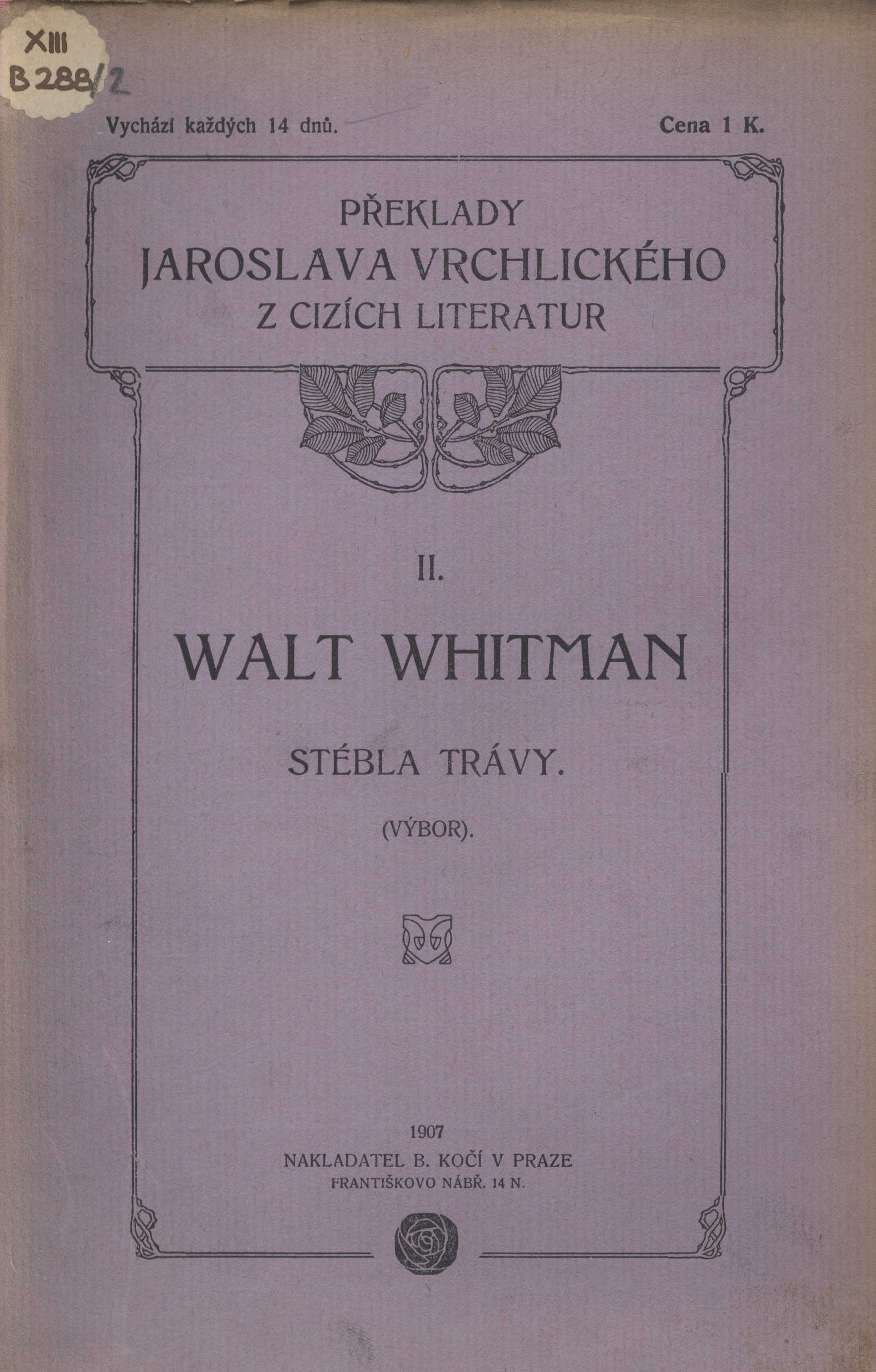 Názvové údaje Stébla trávy : výbor / Walt Whitman Osobní jméno Whitman, Walt, 1819-1892 (Autor) Další autoři Vrchlický, Jaroslav, 1853-1912 (Překladatel) (Autor úvodu atd.) (Dedikátor) Karásek ze Lvovic, Jiří, 1871-1951 (Dedikant) Korp. B. Kočí (nakladatelství a knihkupectví) (Nakladatel, vydavatel) Th. Venta (knihtiskárna, nakladatelství) (Tiskař) Nakladatel V Praze : B. Kočí, 1906 Výrobce (Knihtiskárna Th. Venty) Rozsah 130 s. ISBN brož. Edice Překlady Jaroslava Vrchlického z cizích literatur 2.