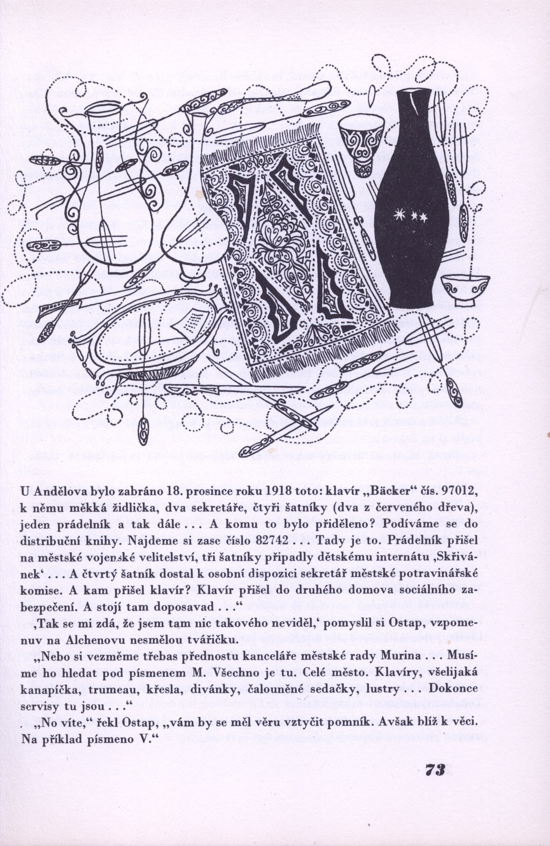 Uživatelské pole PNPU sign. OŘíha 343 původní barevně ilustrovaná obálka (V. Fuka). - Na přední záložce upoutávka na knihu a adresa nakladatelství. - Vazba bílá, plátěná, zdobená barevnou ražbou s ilustrací (V. Fuka). - Barevně ilustrované předsádky (V. Fuka). - Nakladatelská značka. - Barevně ilustrovaný patitul (V. Fuka). - Titulní list s ilustrací (V. Fuka). - Četné celostránkové barevné ilustrace a černobílé v textu (V. Fuka). - Doslov (V. Lacina). - Obsah. - Tiráž. - Na zadní záložce upoutávka na jiný titul. - Na zadní straně obálky nakladatelská značka. - Původní papírová obálka v krajích a hranách mírně narušená, barva v přehybu částečně sedřená, na zadní straně zašpiněná; bílá plátnová vazba mírně zašpiněná; blok zvenčí mírně zašpiněn a některé listy se skvrnami. Jinak zachovalý výtisk.