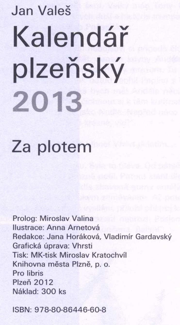 Názvové údaje Kalendář plzeňský 2013 : kratochvilné čtení na každý měsíc. Za plotem / Jan Valeš Osobní jméno Valeš, Jan (Autor) Další autoři Valina, Mirek, 1963- (Autor úvodu atd.) Štěpán Arnetová, Anna, 1980- (Ilustrátor) Korp. Knihovna města Plzně (Nakladatel, vydavatel) Pro libris (občanské sdružení, Plzeň) (Nakladatel, vydavatel) Roč., číslo 2013 Další var.názvy Za plotem Nakladatel Plzeň : Knihovna města Plzně : Pro libris, 2012 Rozsah 47 stran : ilustrace ; 21 cm ISBN 978-80-86446-60-8 (brožováno) Země vyd. Česko Jazyk dok. čeština Poznámky Frontispis. - Čb. ilustrace v textu. - 300 výtisků