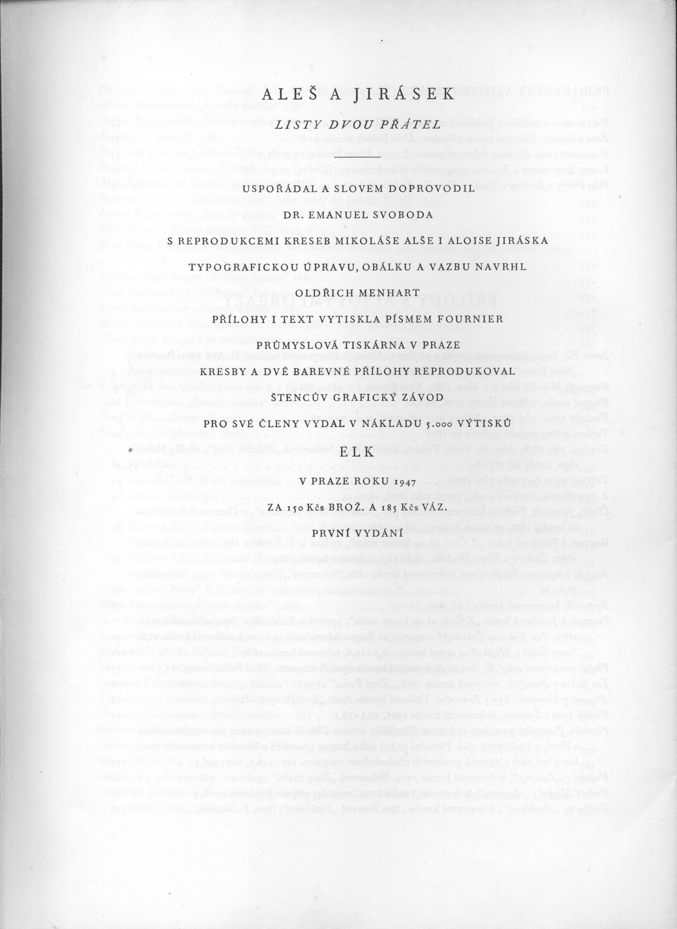 Tiráž: "Aleš a Jirásek. Listy dvou přátel. Uspořádal a slovem doprovodil dr. Emanuel Svoboda. S reprodukcemi kreseb Mikoláše Alše i Aloise Jiráska. Typografickou úpravu, obálku a vazbu navrhl Oldřich Menhart. Přílohy i text vytiskla písmem Fournier Průmyslová tiskárna v Praze. Kresby a dvě barevné přílohy reprodukoval Štencův grafický závod. Pro své členy vydal v nákladu 5.000 výtisků ELK v Praze roku 1947. Za 150 Kčs brož. a 185 Kčs váz. První vydání."