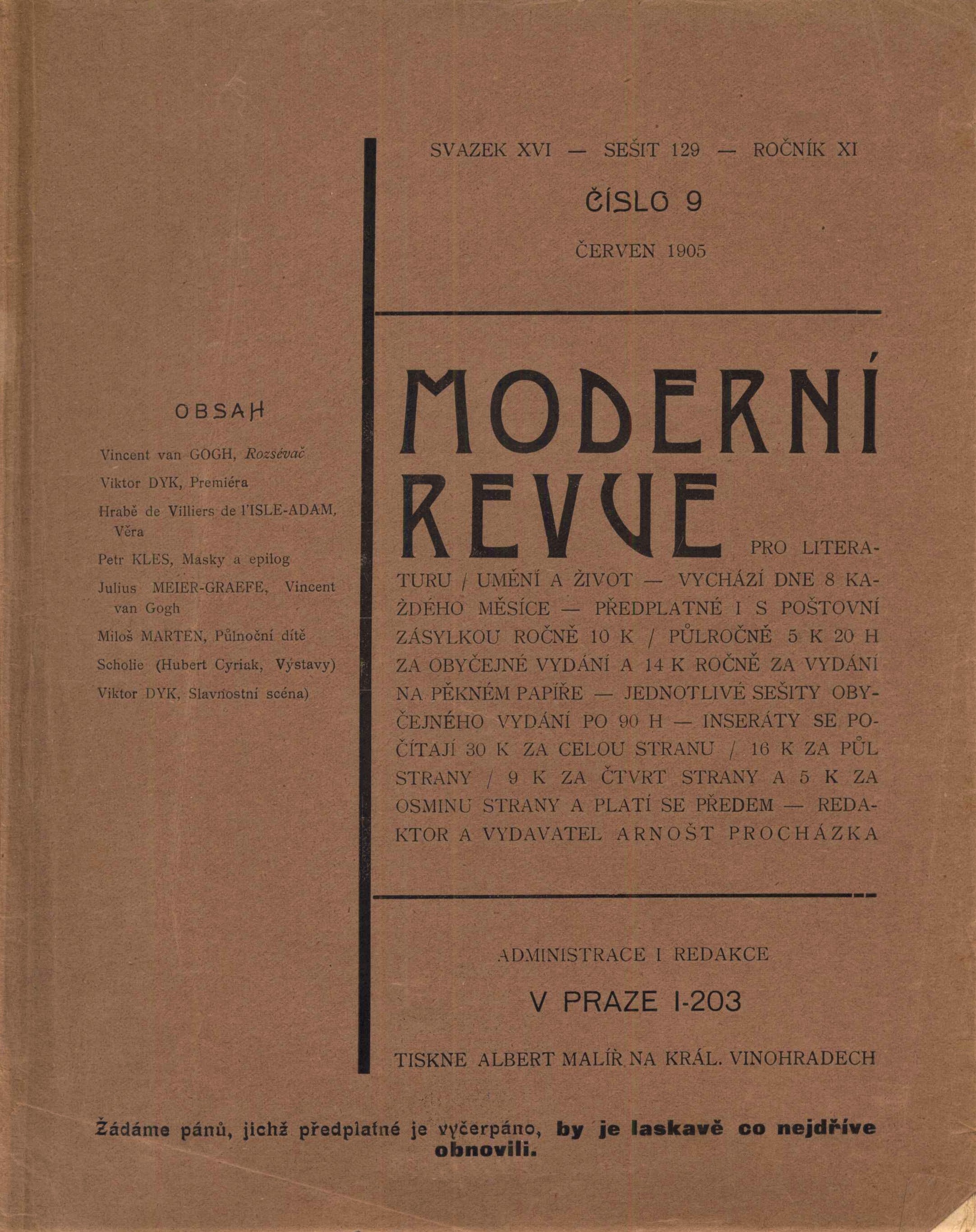 Názvové údaje Moderní revue : pro literaturu, umění a život Další autoři Procházka, Arnošt, 1869-1925 (Redaktor, výkonný redaktor) (Nakladatel, vydavatel) Brunner, Vratislav Hugo, 1886-1928 (Litograf) (Grafický technik) Korp. Albert Malíř (tiskárna a nakladatelství) (Tiskař) Roč., číslo Ročník 11, svazek 16, číslo 1-12, 1904/1905 Nakladatel Praha : Arnošt Procházka, 1904-1905 Výrobce Na Král. Vinohradech : tiskem Alberta Malíře Rozsah 582 stran : ilustrace ; 23 cm Země vyd. Česko Jazyk dok. čeština Poznámky Černobílé ilustrace (G. Craig, Ch. Doudelet, F. Flaum, A. Gallén, V. van Gogh, J. Sattler, F. Šimon, J. Veth, O. Redon). - Část nákladu přednostní doplněná původní litografií V. H. Brunnera Červený smích. - Na obálkách uvedeno rovněž průběžné číslování sešitů od začátku vydávání.