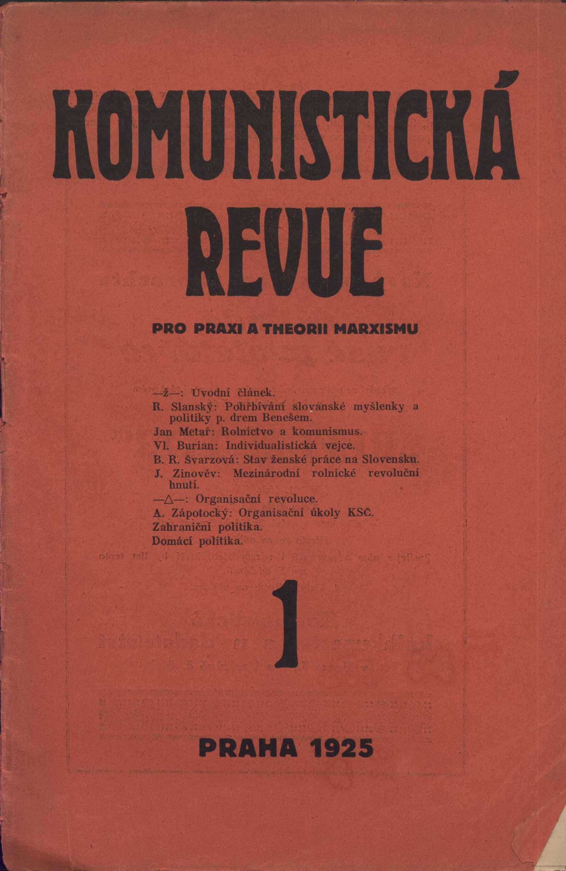 Názvové údaje Komunistická revue : orgán Komunistické strany v Československu (Sekce III. Komunistické Internacionály) Další autoři Komunistické knihkupectví a nakladatelství (Nakladatel, vydavatel) "Grafia", dělnická knihtiskárna (tiskárna, nakladatelství) (prt (Praha)) Roč., číslo ročník 2 (6), číslo 1, 1925 Nakladatel Praha : Komunistické knihkupectví a nakladatelství, 1925 Výrobce (Tiskem Grafie, dělnické knihtiskárny) Země vyd. Česko Jazyk dok. čeština Poznámky Název na obálce: Komunistická revue pro praxi a theorii marxismu