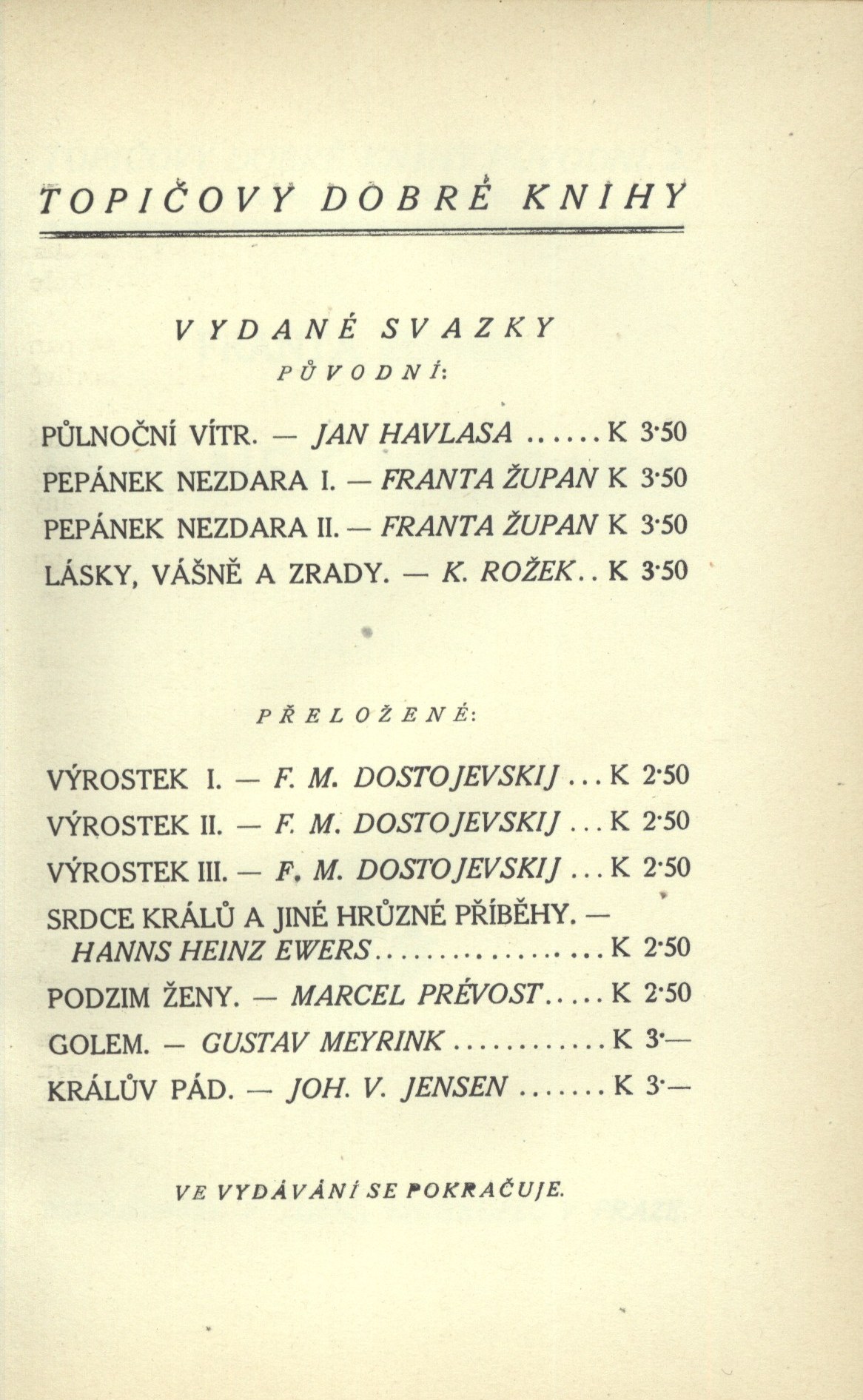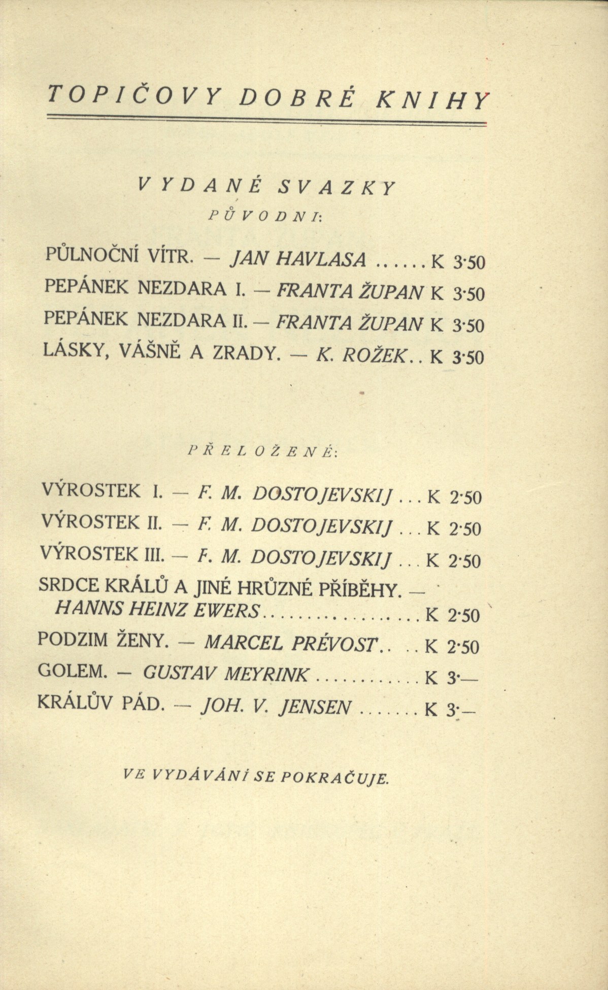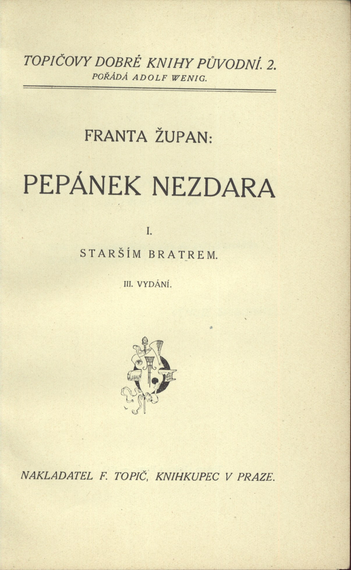 Topičovy Dobré knihy původní, (F. Topič)Země vyd. Česko Jazyk dok. čeština Poznámky Zdobená vazba. - Zdobené předsádky. - Ediční soupis. - Edice nad titulem, nakladatelská značka. - Tiskárna. - Obsah. - Poznámka o autorovi, kreslený portrét. - Koncová vinětka. - Bez tiráže. - 1 přívazek.