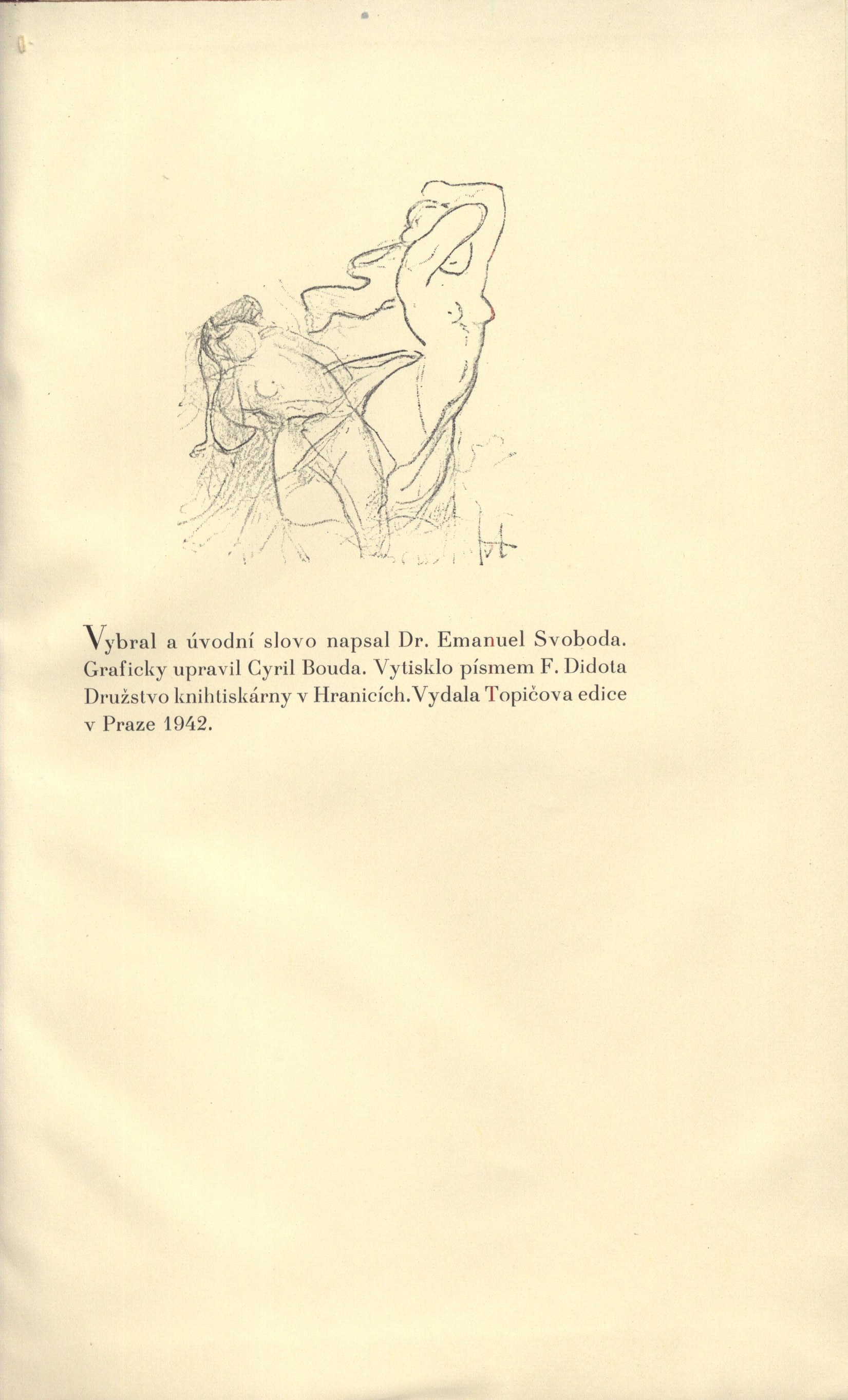 Názvové údaje Akty / Mikoláš Aleš ; vybral a úvodní slovo napsal Emanuel Svoboda ; graficky upravil Cyril Bouda Osobní jméno Aleš, Mikoláš, 1852-1913 (Umělec) (Ilustrátor) Další autoři Svoboda, Emanuel, 1883-1967 (Sestavovatel, kompilátor) (Autor doslovu, tiráže atd.) Bouda, Cyril, 1901-1984 (Knižní grafik) Korp. Topičova edice (nakladatelství) (Nakladatel, vydavatel) Družstvo knihtiskárny (tiskárna, Hranice, Přerov) (Tiskař) Nakladatel V Praze : Topičova edice, 1942 Výrobce V Hranicích : Družstvo knihtiskárny Rozsah xliv, 189 srean : ilustrace ; 24 cm ISBN (Vázáno) Země vyd. Česko Jazyk dok. čeština Poznámky Vazba. - Dvoubarevný titulní list s ilustrací. - Úvodní slovo a Doslov. - Barevná příloha (římské číslování). - Černobílá obrazová příloha. - Obsah. - Tiráž s ilustrací.