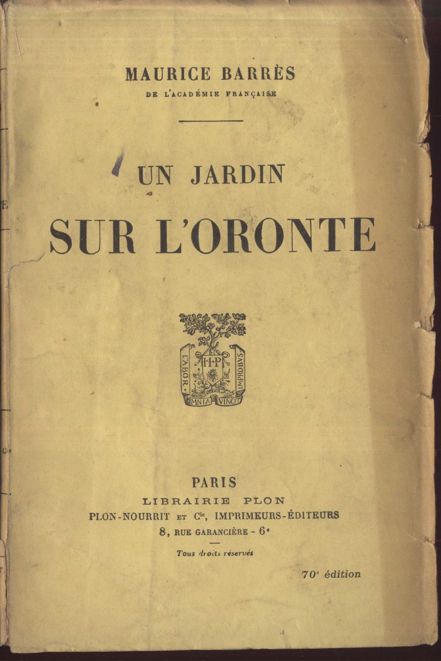 Názvové údaje Un Jardin sur l'Oronte / Maurice Barrès Osobní jméno Barrès, Maurice, 1862-1923 (Autor) Další autoři Pellé, Maurice César Joseph, 1863-1924 (Dřívější majitel) (Autor podpisu) Korp. Librairie Plon. Les petit-fils de Plon et Nourrit (Paris, Francie) (Nakladatel, vydavatel) (Tiskař) Nakladatel Paris : Librairie Plon, copyright1922 Rozsah 307 s. ISBN (brožováno) Země vyd. Francie Jazyk dok. francouzština Poznámky Na obálce a titulním listu nakladatelský signet. - Informace o dalších dílech autora. - Nakladatelská reklama.