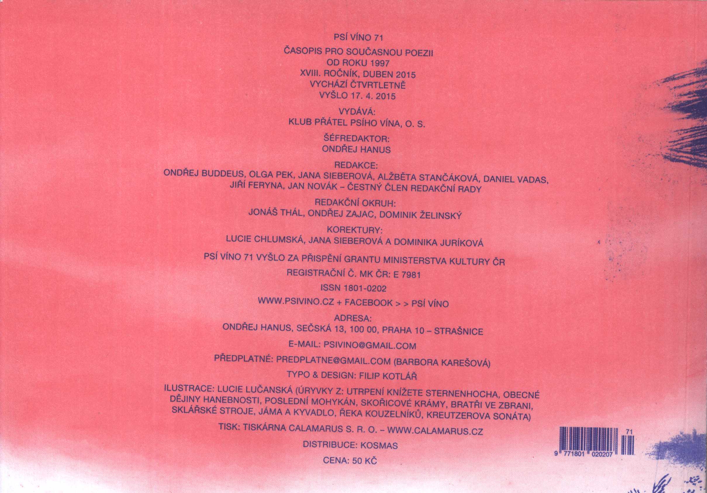 Title information Psí víno : časopis pro současnou poezii Další autoři Hanus, Ondřej, 1987- (Publishing director) Stančáková, Alžběta, 1992- (Author of introduction) Lučanská, Lucie, 1990- (Illustrator) Corporation Klub přátel Psího vína (občanská sdružení) (Publisher) Calamarus (tiskárna) (Printer) Roč., číslo Ročník 18, číslo 71, 2015 Publication Praha : Klub přátel Psího vína, 2015 Manufacture Tiskárna Calamarus s. r. o. Scope 136 stran : ilustrace ; 15 cm Country Czech Republic Language Czech Note Zdobená barevná obálka. - Černobílé celostránkové ilustrace. - Medailonky autorů. - Tiráž na zadní straně obálky.