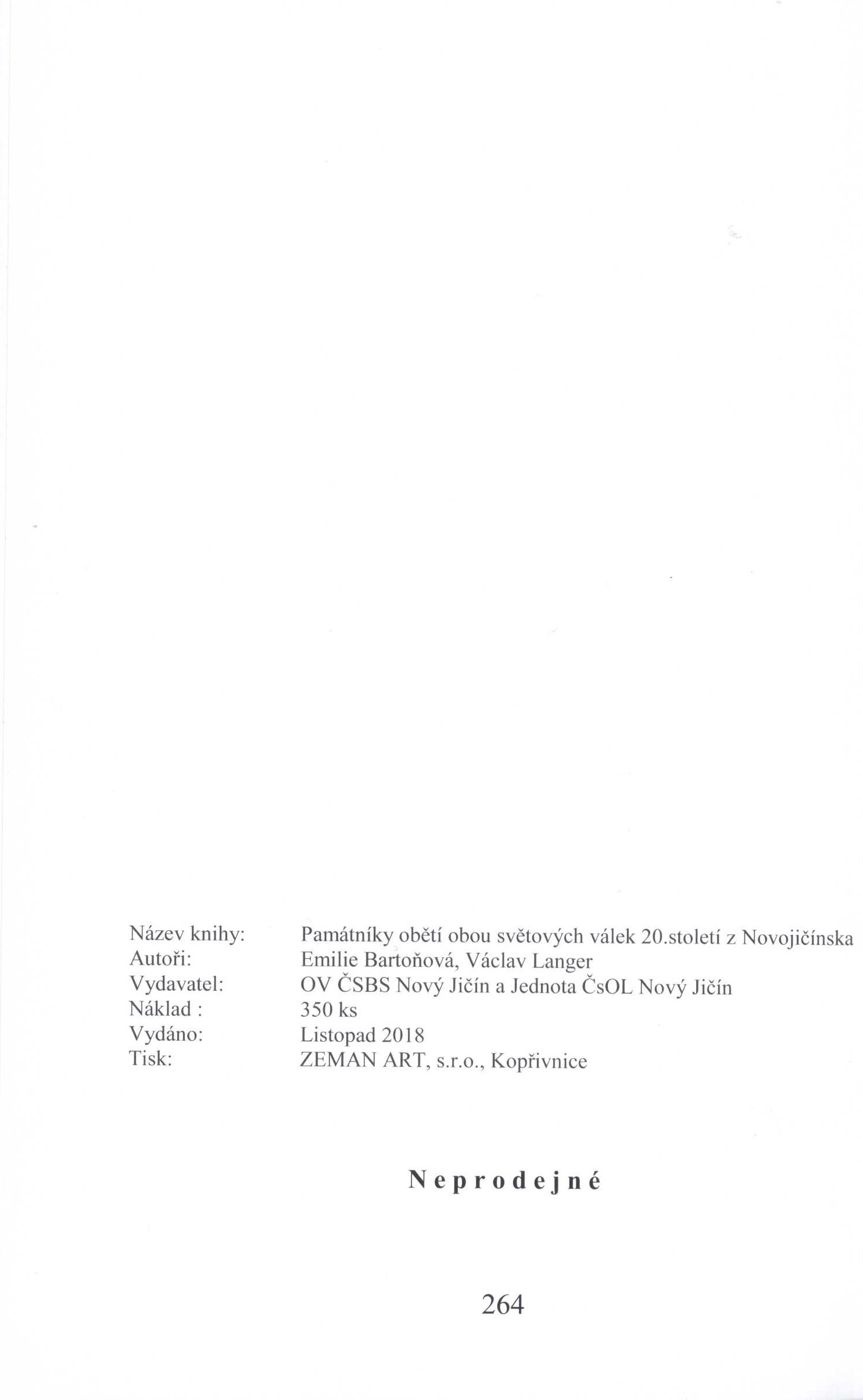 Názvové údaje Památníky obětí obou světových válek 20. století z Novojičínska / Emilie Bartoňová, Václav Langer Osobní jméno Bartoňová, Emilie (Autor) Další autoři Langer, Václav, 1934- (Autor) Korp. ZEMAN ART, s.r.o. (tiskárna) (Tiskař) Český svaz bojovníků za svobodu. Oblastní výbor Lidice (Nakladatel, vydavatel) Československá obec legionářská. Jednota Nový Jičín (Nakladatel, vydavatel) Nakladatel Nový Jičín : Český svaz bojovníků za svobodu, Oblastní výbor Nový Jičín : Československá obec legionářská, Jednota Nový Jičín, 2018 Výrobce Kopřivnice : ZEMAN ART, s.r.o. Rozsah 264 stran : barevné ilustrace ; 22 cm ISBN 978-80-270-5796-2 (v knize neuvedeno ; vázáno) : neprodejné Země vyd. Česko Jazyk dok. čeština Poznámky Modrá vazba s barevnou fotografií, černý text. - Přispěvatelé vydání knihy. - Úvod autorů. - Obsah. - Pamětní místa (barevná fotografie, popis, poznámky). - Doslov. - Na zadní straně vazby barevné znaky OV ČSBS Nový Jičín a Jednoty ČsOL Nový Jičín.