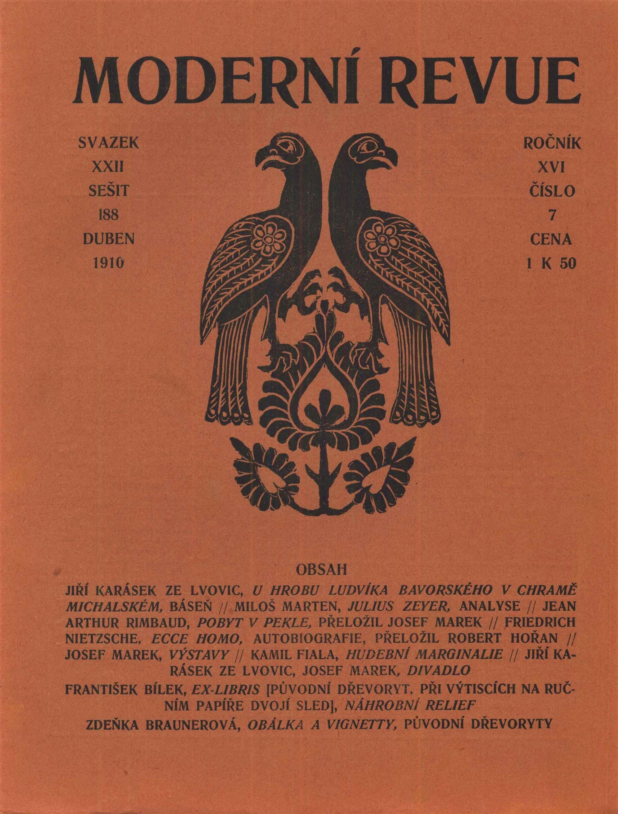 Poznámky Identická obálka (zdobená dřevorytem Zdenky Braunerové) pro všechna čísla (na přední straně dřevoryt a obsah čísla, na druhé tiráž, na druhé až čtvrté reklamy a přehled knih zaslaných redakci). - Ilustrováno černobílými dřevorytovými vinětami Zdenky Braunerové (ve všech číslech).