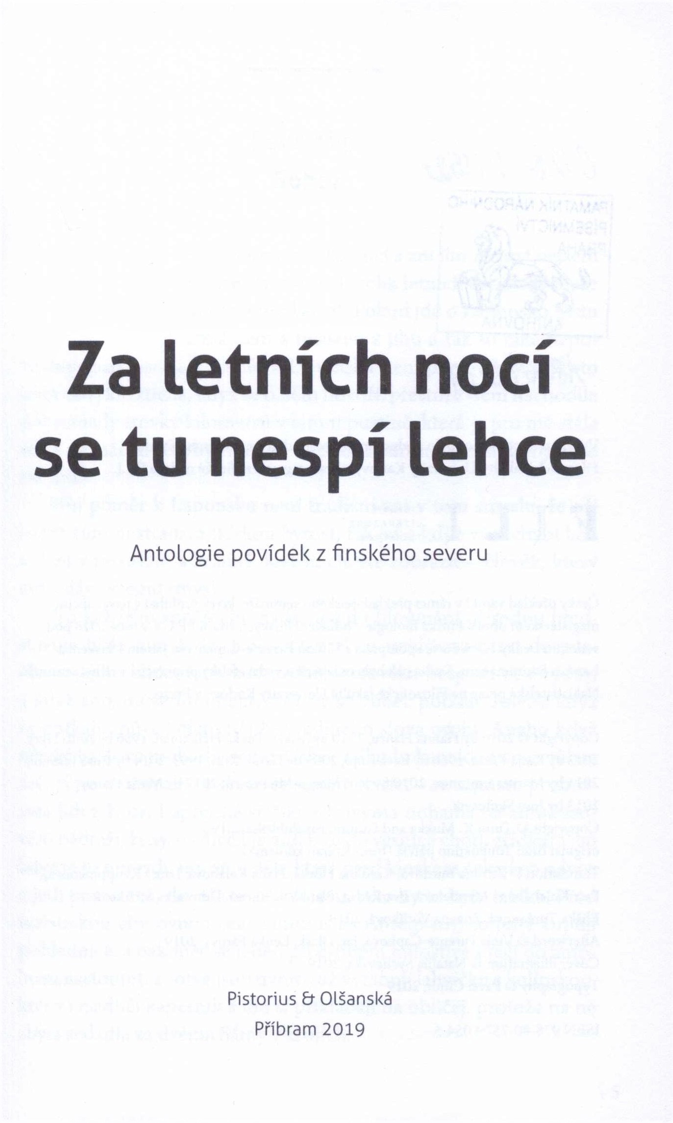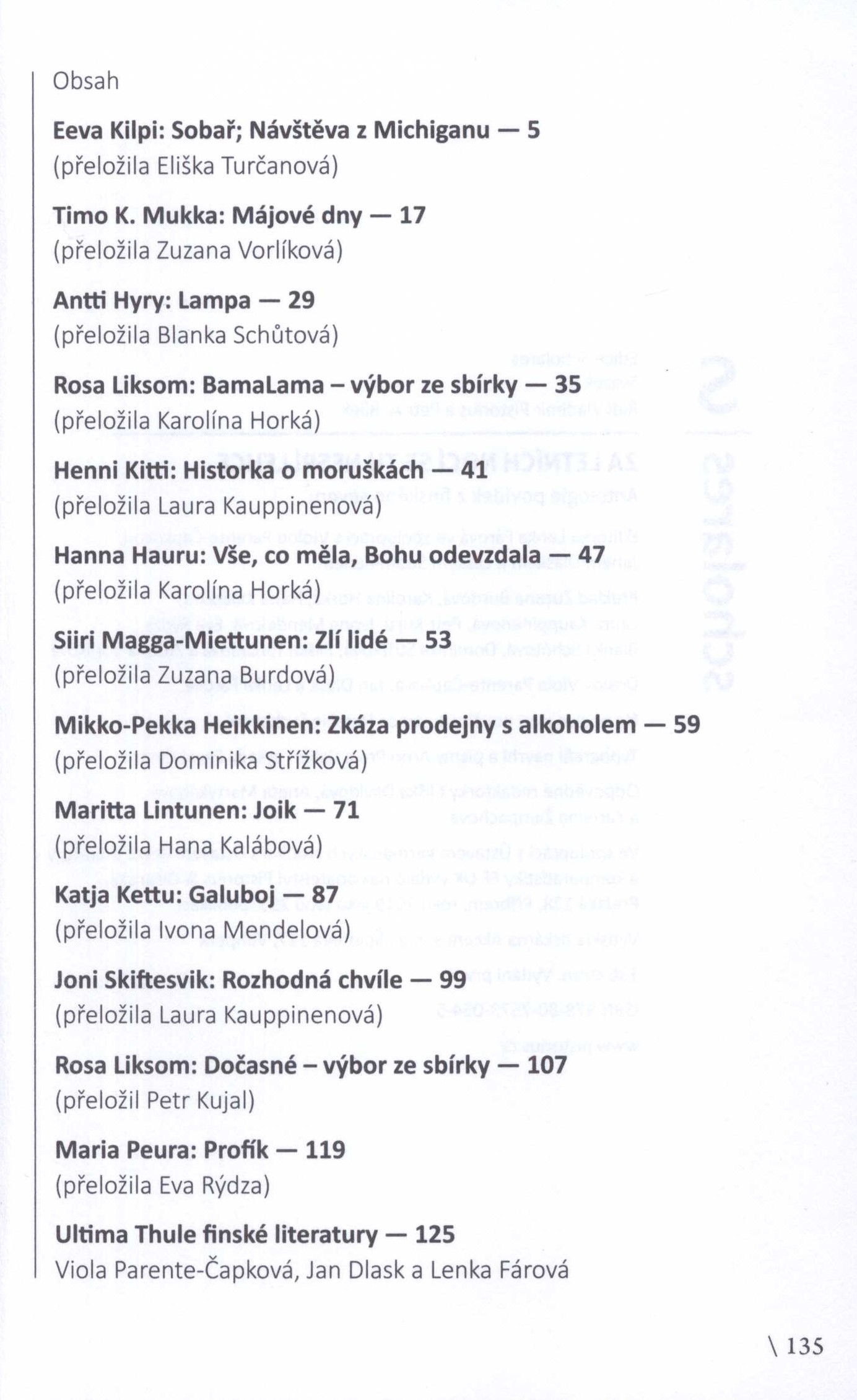 Scholares, (Pistorius & Olšanská)Země vyd. Česko Jazyk dok. čeština Jazyk orig. finština Poznámky Přeloženo z finštiny. - Barevná obálka s ilustrací, dvoubarevný text, ediční značka na hřbetu. - Na přední záložce anotace knihy, na zadní seznam finských autorů. - Bílá vazba s černobílou ilustrací, na hřbetě černý text a ediční značka. - Ediční značka na vakátě. - U každé povídky na konci uveden překladatel a stručná biografie a bibliografie autora originálu. - Doslov "Ultima Thule finské literatury" od V. Parent-Čapkové, J. Dlaska a L. Fárové. - Zdroje překladu. - Obsah. - Úryvek z textu na zadní, ilustrované, straně obálky. - Přebal.