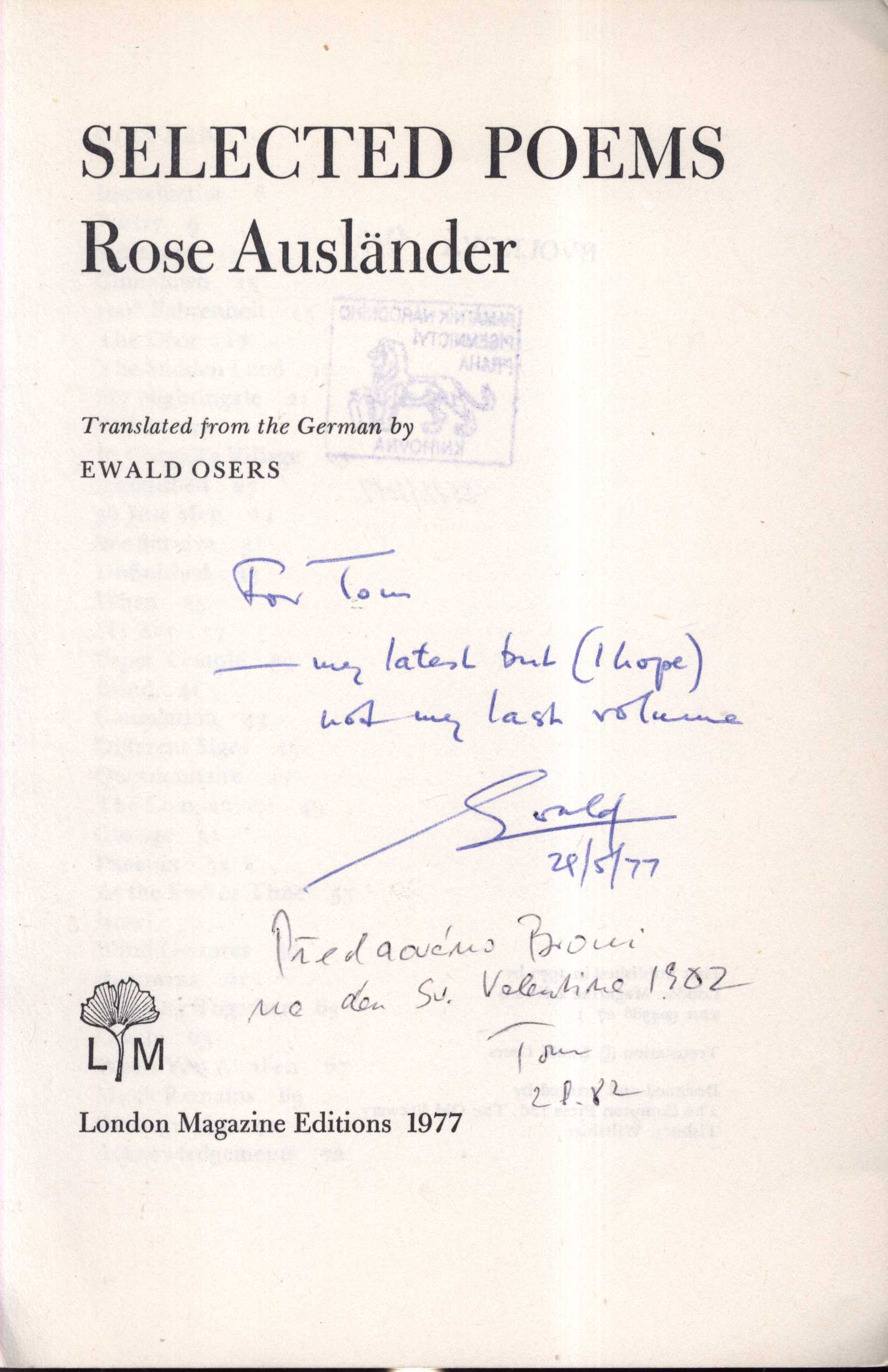 1. Názvové údajeSelected poems / Rose Ausländer ; traslated from the German by Ewald Osers
