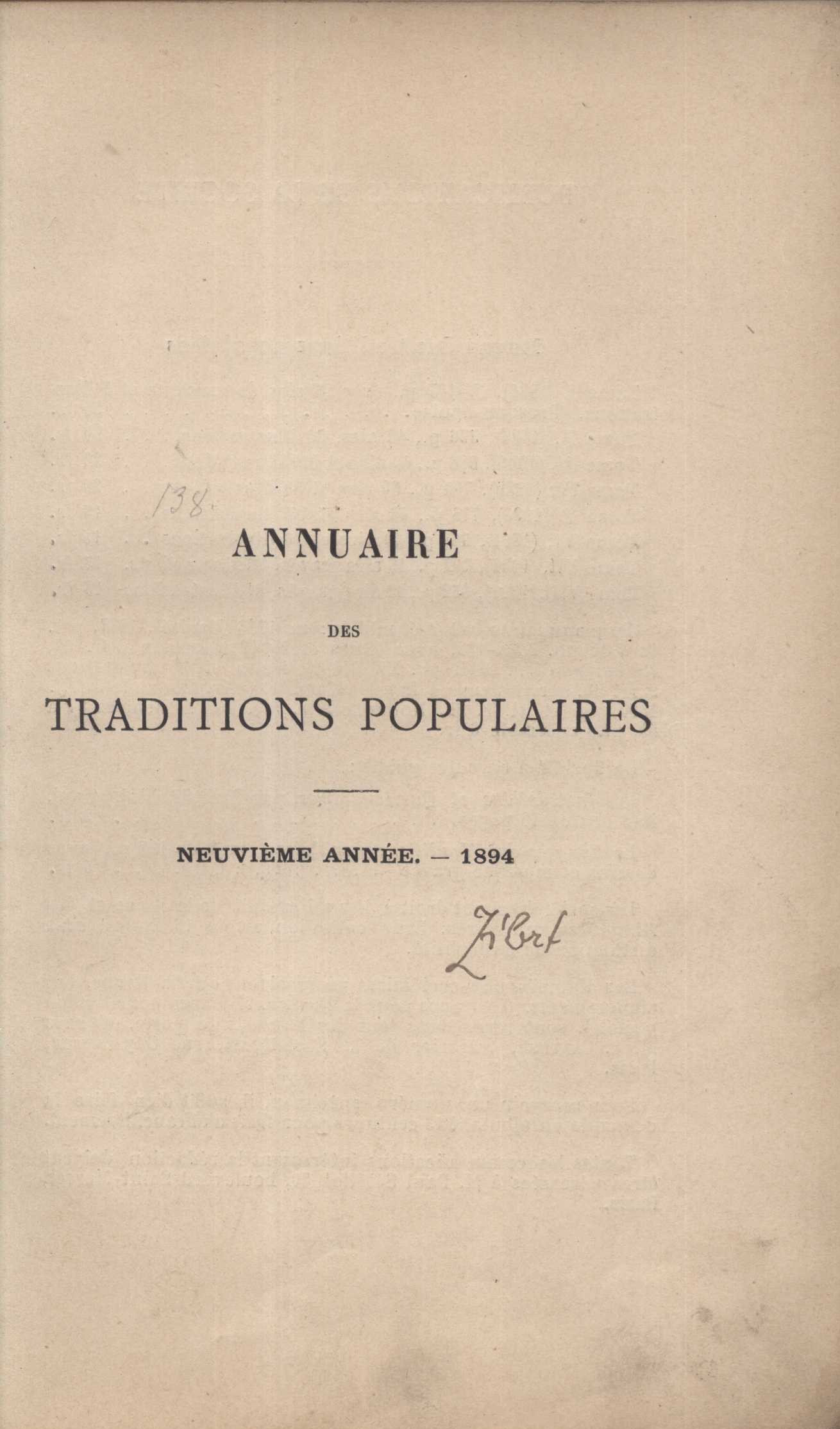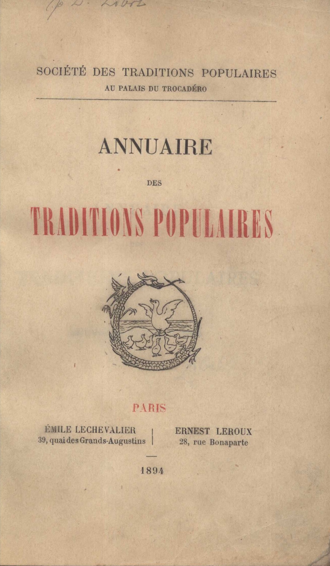 Title information Annuaire des traditions populaires Roč., číslo Ročník 9, 1894 Publication Paris : Émile Lechevalier : Ernest Leroux, 1894 Manufacture Baugé (Maine-et-Loire) : Imprimerie Daloux Scope 164 stran : ilustrace ; 19,5 cm ISSN 1638-8763 Country France Language French Note Nad názvem "Société des traditions populaires au Palais du Trocadéro". - Čb. ilustrace