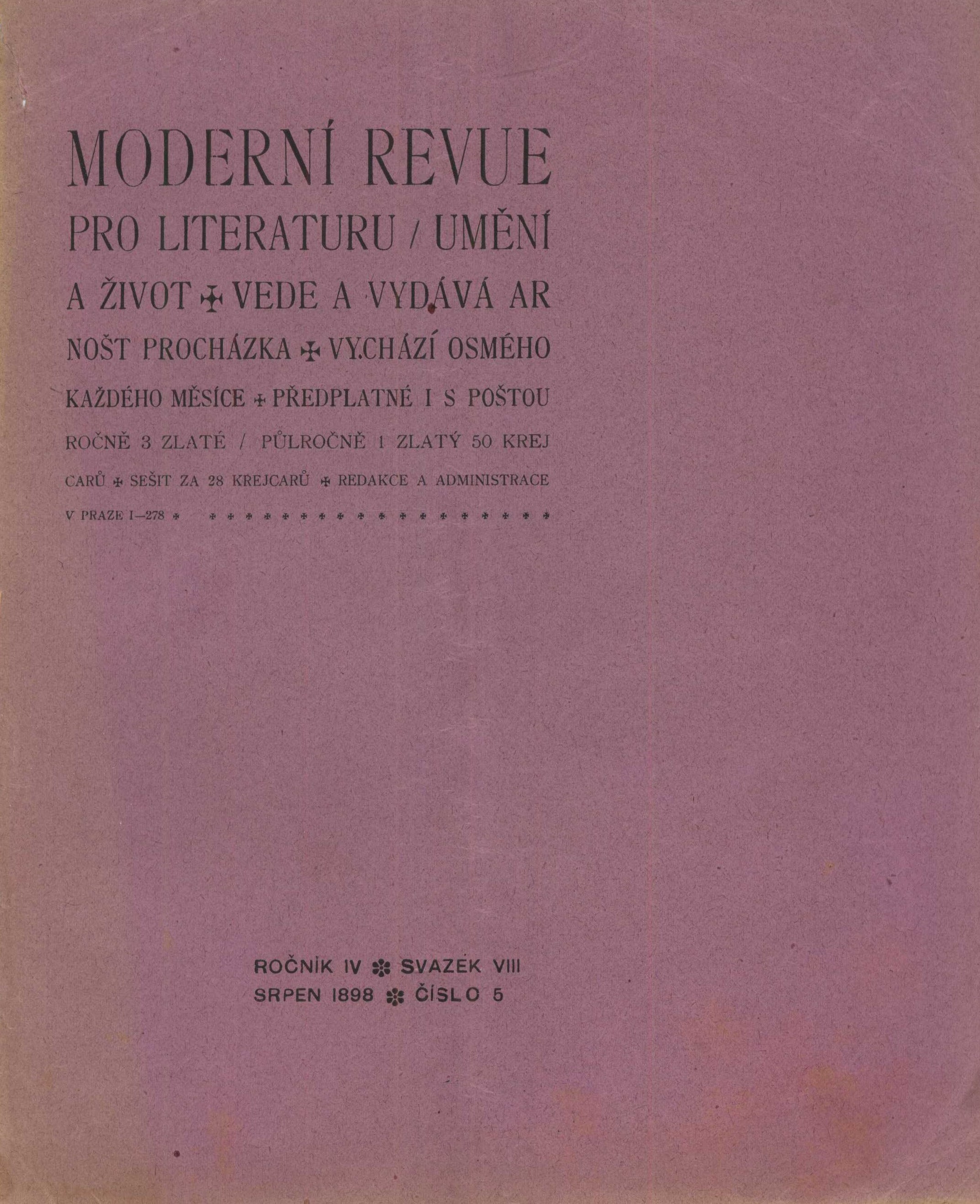 Názvové údaje Moderní revue : pro literaturu, umění a život Další autoři Procházka, Arnošt, 1869-1925 (Redaktor, výkonný redaktor) (Nakladatel, vydavatel) Stivín, Emanuel, 1848-1925 (Tiskař) Roč., číslo Ročník 4, svazek 8, číslo 1-6, 1898 Nakladatel V Praze : Arnošt Procházka, 1898 Výrobce Tiskem Em. Stivína Rozsah 188 stran : ilustrace ; 23 cm Země vyd. Česko Jazyk dok. čeština Poznámky Typografické obálky v různých barevných provedeních. - Čb. ilustrace. - Průběžné stránkování.