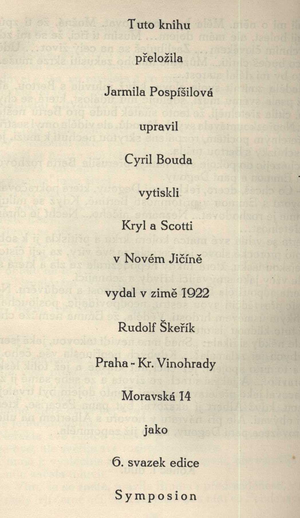 Poznámky Slepotiskovými ornamenty zdobená vínová vazba. - Na první stránce stylizovaná značka edice. - Červený a černý tisk titulního listu s drobnou ilustrací.