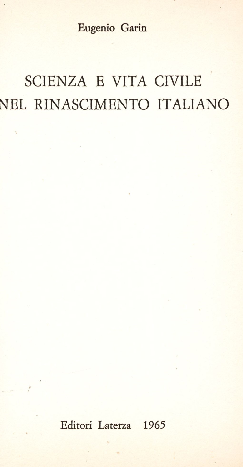 Názvové údaje Scienza e vita civile nel Rinascimento italiano / Eugenio Garin Osobní jméno Garin, Eugenio, 1909-2004 (Autor) Další autoři Editori Laterza (Nakladatel, vydavatel) (Tiskař) Nakladatel Bari : Editori Laterza, 1965 Výrobce d´arti grafiche Gius. Laterza & Figli Rozsah 181 stran ; 18 cm ISBN (brožováno) Edice Universale Laterza ; 21