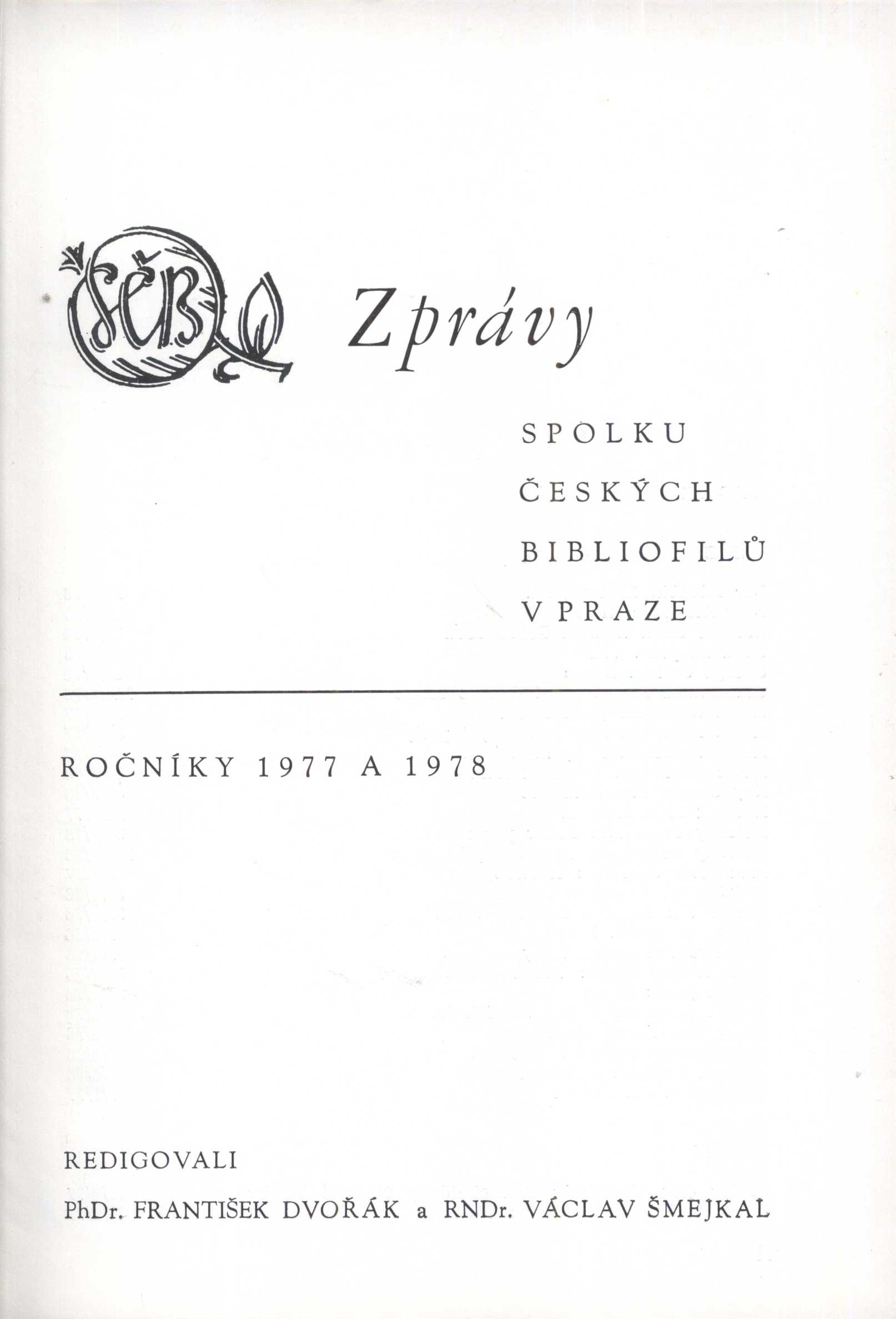 Poznámka o dalších původcích Redigují František Dvořák a Václav Šmejkal Druh dok. PERIODIKA - Svázaný ročník periodika Periodicita 4x ročně Nadřízená jednotka Zprávy Spolku českých bibliofilů v Praze Heslo korporace (zkrác. heslo korp.) : Spolek českých bibliofilů v Praze Klíčová slova bibliofilové * bibliofilská vydání * bibliofilské spolky * bibliofilské tisky * bibliofilství * r. 1977 * české časopisy * zpravodaj MDT (0.027.6) * 821.162.3-92 Uživatelské pole PNP Sign. M 155 e 11: béžová celoplátěná nakladatelská vazba s červeným hřbetním názvem a písmeny SČB na přední straně; kompletní ročník, vevázán titulní list a obsah ročníků 1977 a 1978 (viii s.) a 2 čb. grafické listy. - Svázáno v jednom svazku spolu s roč. 1978