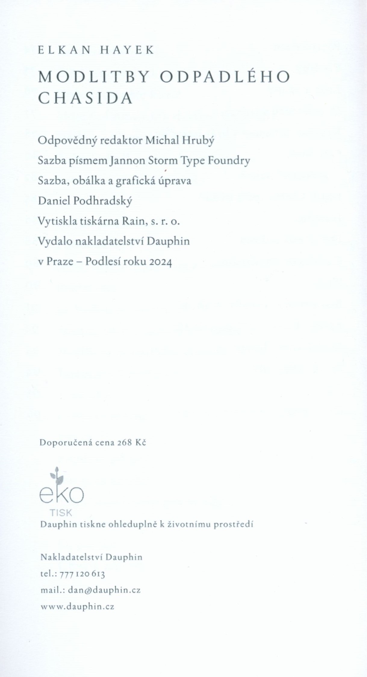 Názvové údaje Modlitby odpadlého chasida / Elkan Hayek ; sazba, obálka a grafická úprava Daniel Podhradský Osobní jméno Hayek, Elkan, 1964- (Autor) Další autoři Podhradský, Daniel, 1967- (Sazeč) (Autor obálky) (Knižní grafik) Korp. Nakladatelství Dauphin (Nakladatel, vydavatel) Rain (tiskárna) (Tiskař) Nakladatel V Praze-Podlesí ; Dauphin, 2024 Výrobce [Jindřichův Hradec] : Rain, s.r.o. Rozsah 97 stran ; 20 cm ISBN 978-80-7645-612-9 (brožováno) Země vyd. Česko Jazyk dok. čeština Poznámky Barevná obálka s nakladatelskou značkou, bílý text (i na hřbetu). - Patitul. - Básně. - O mé póze / báseň v próze. - Obsah. - O autorovi na zadní straně obálky.