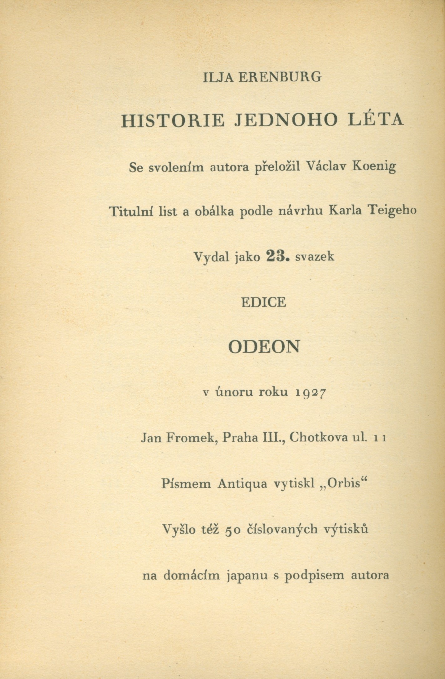 1. Názvové údajeHistorie jednoho léta : román / Ilja Erenburg ; se svolením autora přeložil Václav Koenig
