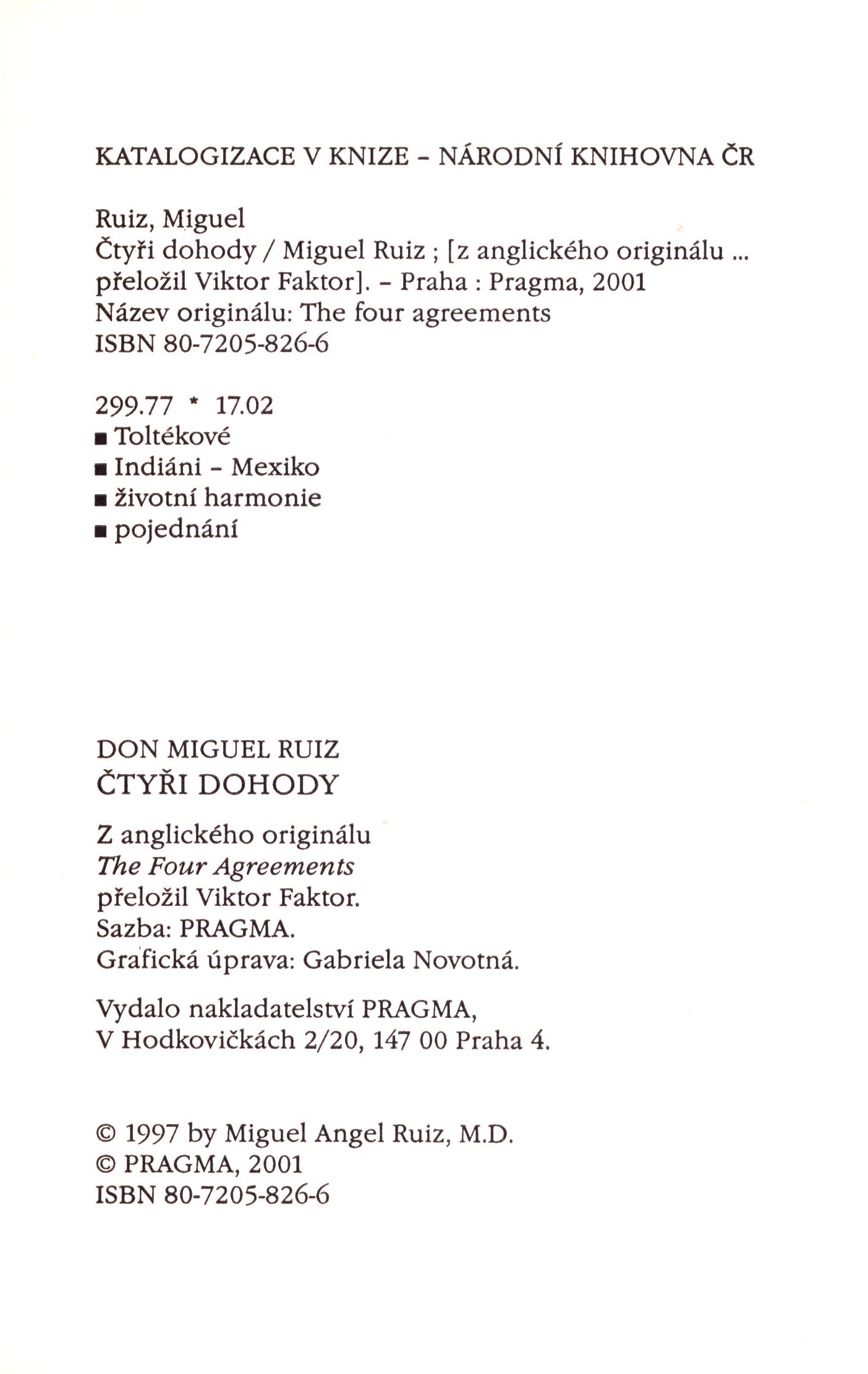 1. Názvové údajeČtyři dohody : kniha moudrosti starých Toltéků : praktický průvodce osobní svobodou / Miguel Ruiz ; z anglického originálu The Four Agreements přeložil Viktor Faktor ; grafická úprava Gabriela Novotná