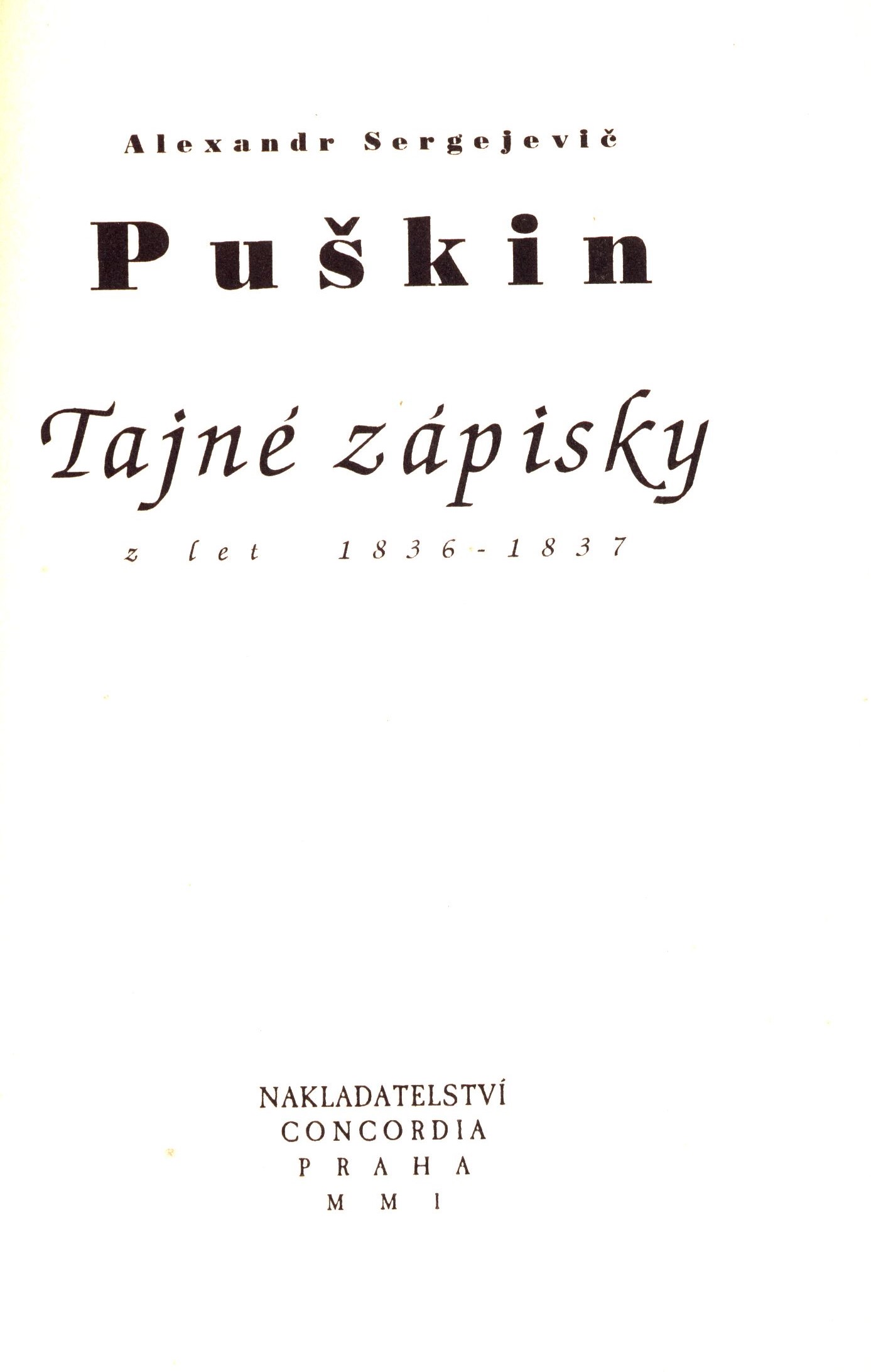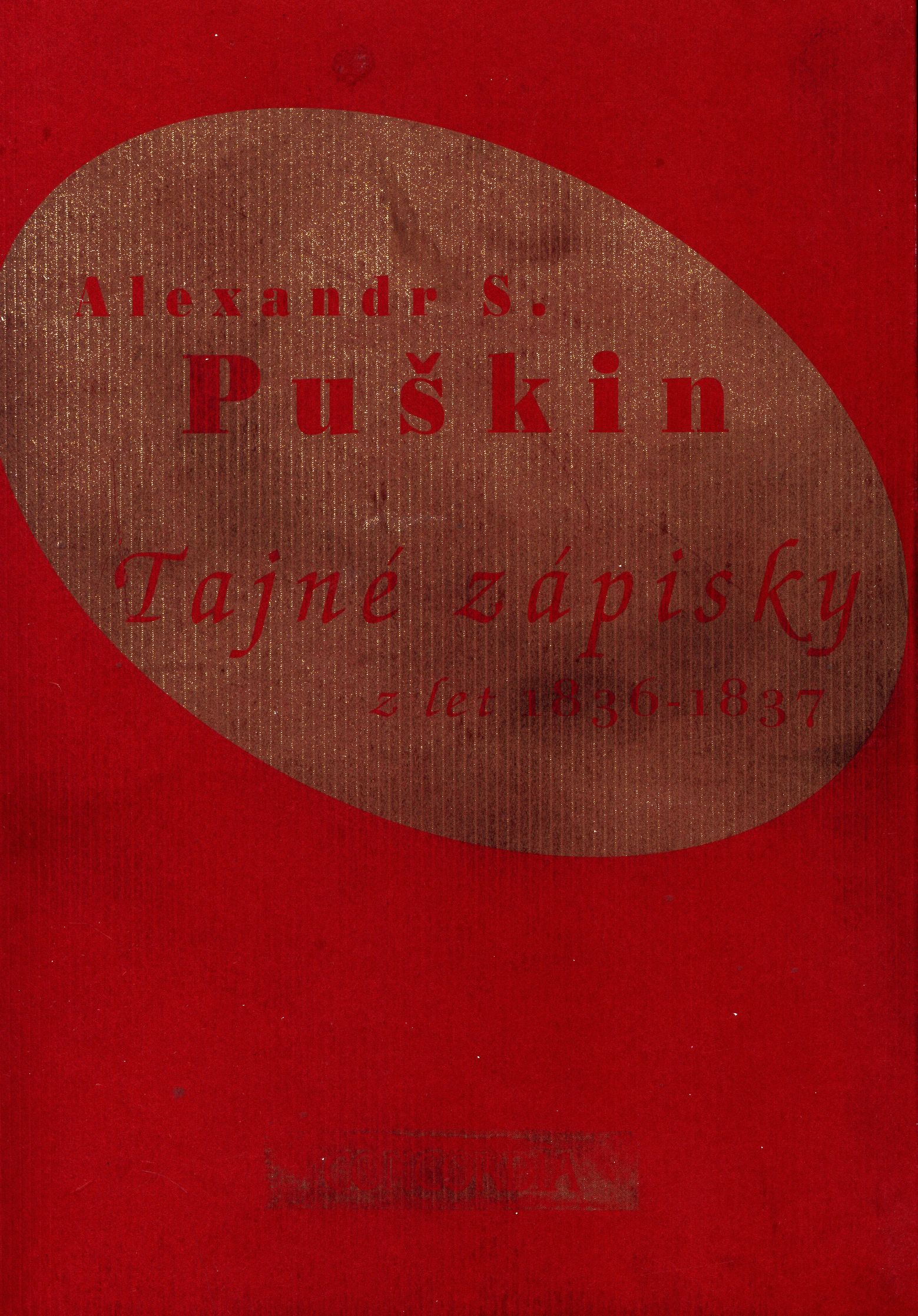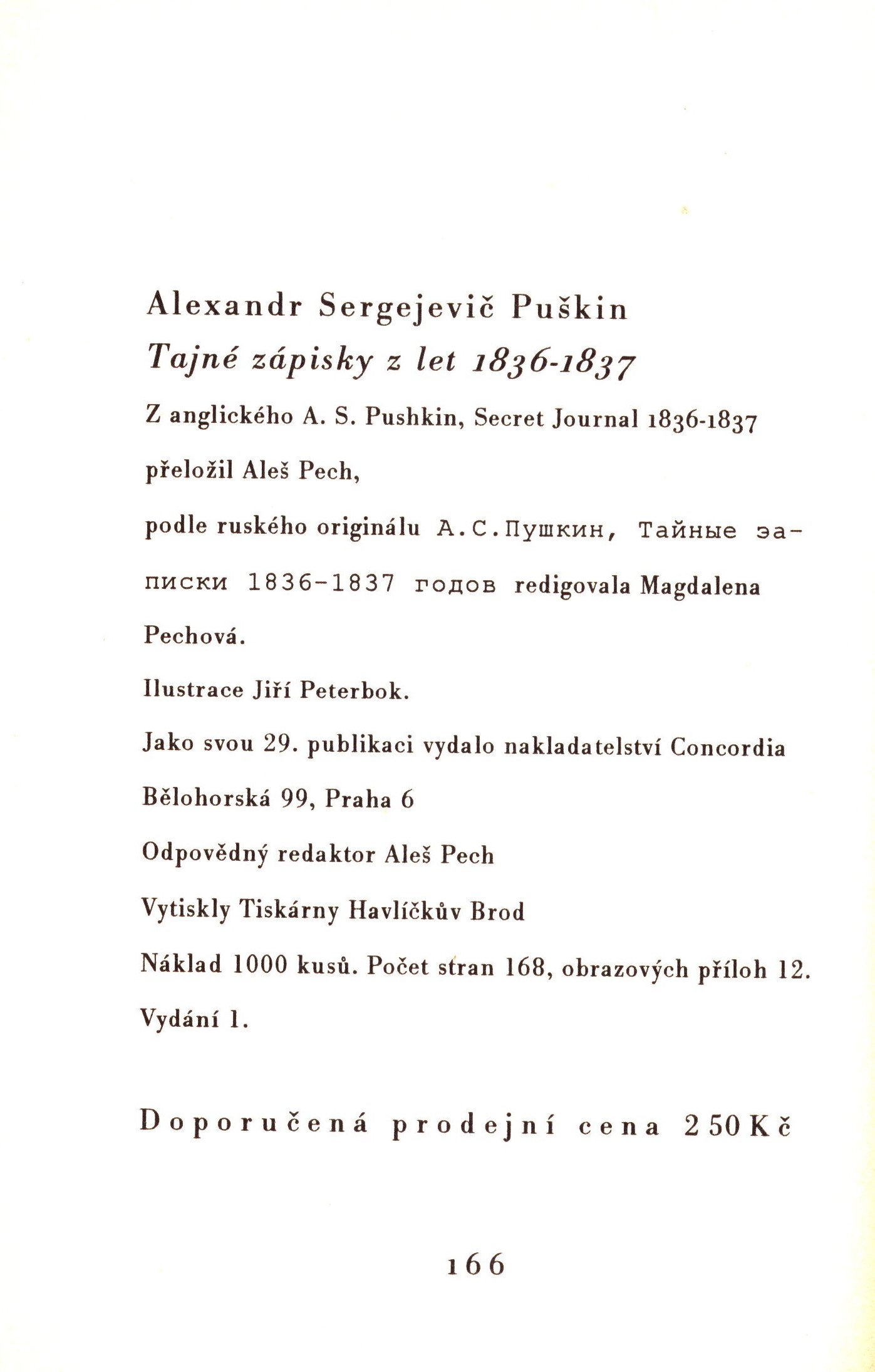 Názvové údaje Tajné zápisky z let 1836-1837 / Alexandr Sergejevič Puškin ; z anglického A. S. Pushkin, Secret Journal 1836-1837 přeložil Aleš Pech ; podle ruského originálu ... redigovala Magdalena Pechová ; ilustrace Jiří Peterbok Osobní jméno Puškin, Aleksandr Sergejevič, 1799-1837 (Autor) Další autoři Pechová, Magdalena (Editor) Petrbok, Jiří, 1962- (Ilustrátor) Pech, Aleš, 1957-2002 (Překladatel) Korp. Concordia (nakladatelství) (Nakladatel, vydavatel) Tiskárny Havlíčkův Brod (firma) (Tiskař) Údaje o vydání vydání 1. Nakladatel Praha : Concordia, 2001 Výrobce Havlíčkův Brod : Tiskárny Havlíčkův Brod Rozsah 168 stran, 12 nečíslovaných listů obrazových příloh : barevné ilustrace ; 20 cm ISBN 80-85997-08-8 (brožováno) Země vyd. Česko Jazyk dok. čeština Jazyk orig. angličtina * ruština Poznámky Barevná zdobená obálka. - Na přední záložce obálky anotace. - Barevné ilustrace. - 1000 výtisků. - Název anglické verze: Secret journal 1836-1837