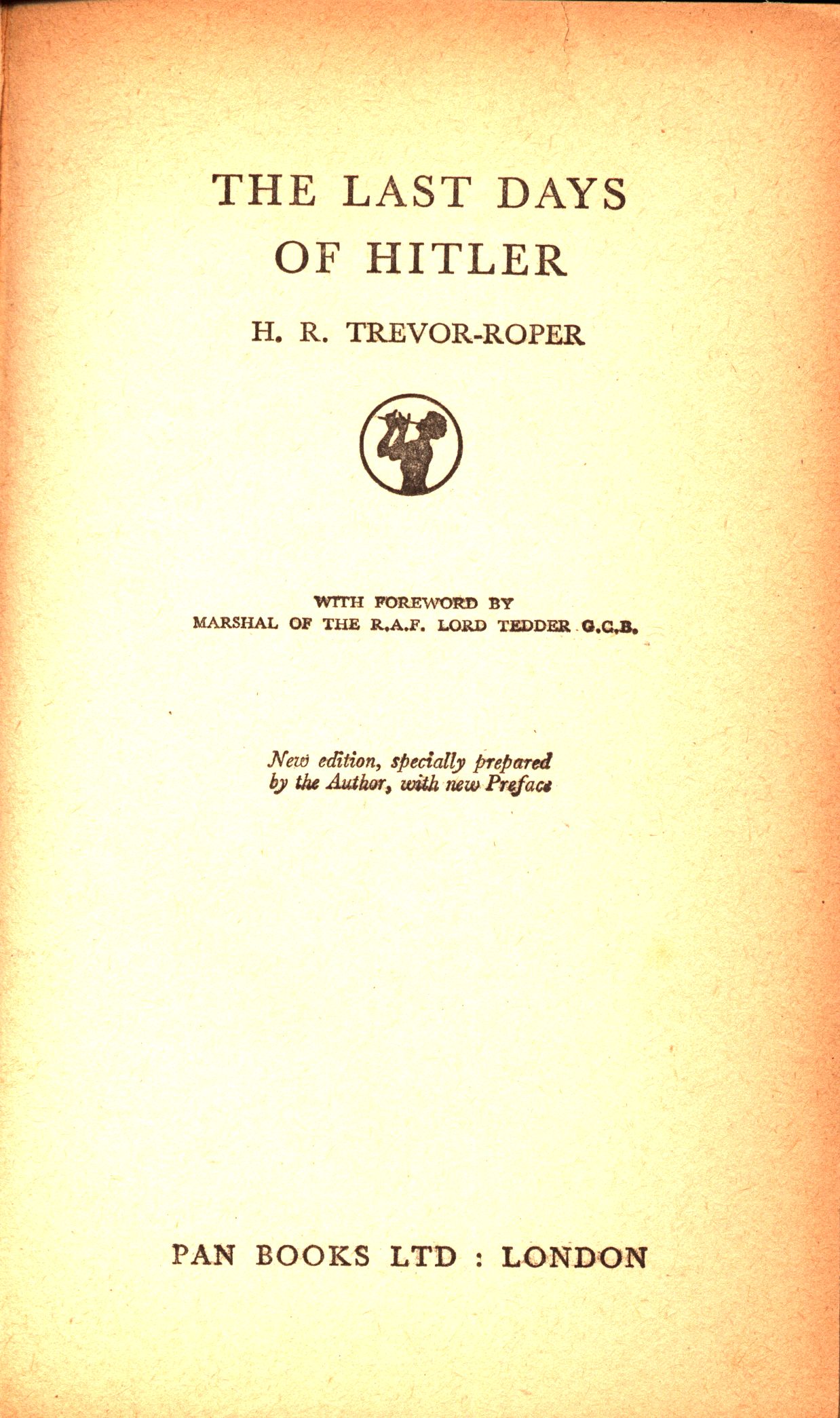 Názvové údaje The last days of Hitler / by H. R. Trevor-Roper ; with foreword by Lord Tedder Osobní jméno Trevor-Roper, H. R. (Hugh Redwald), 1914-2003 (Autor) Další autoři Tedder, Arthur William Tedder, Baron, 1890-1967 (Autor úvodu atd.) Korp. Pan Books, London (nakladatelství) (Nakladatel, vydavatel) Richard Clay & Co (Tiskař) Údaje o vydání New edition Nakladatel London : Pan Books, 1955 Výrobce Bungay : Richard Clay and Company, Ltd. Rozsah 266 stran ; 18 cm ISBN (brožováno) Edice PAN books ; GP12