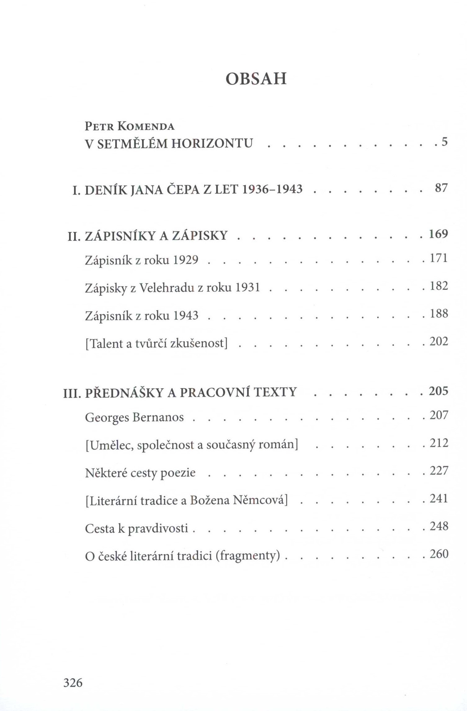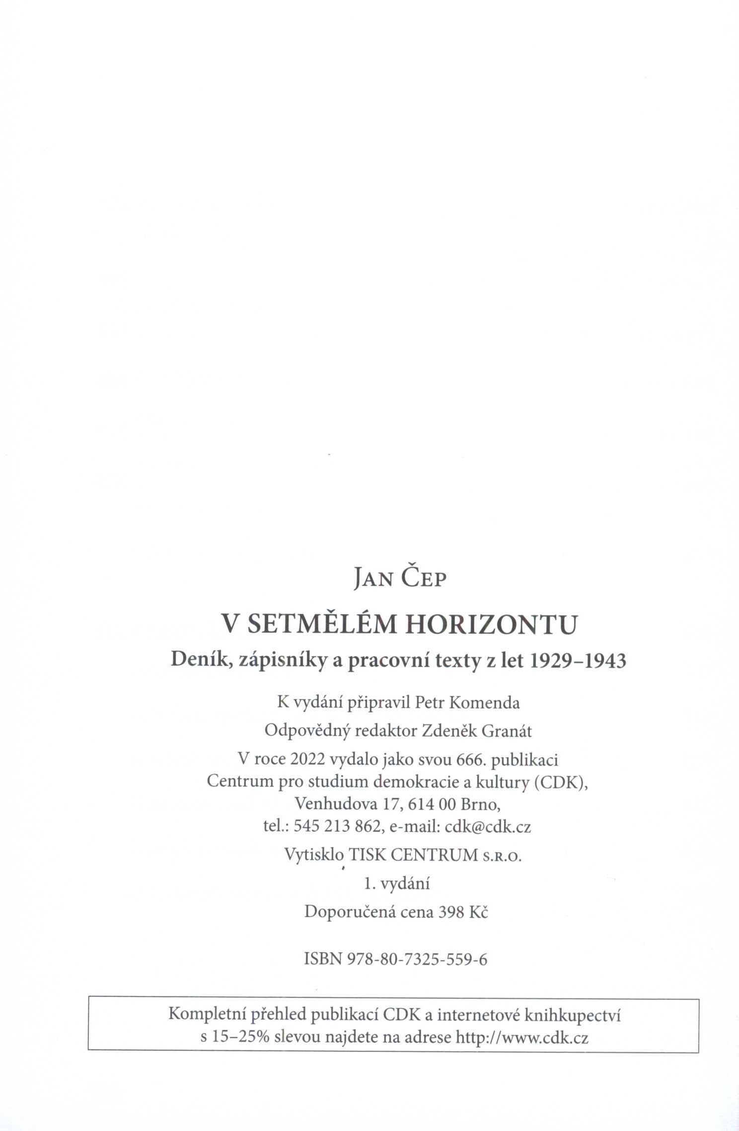 Názvové údaje V setmělém horizontu : deník, zápisníky a pracovní texty z let 1929-1943 / Jan Čep ; k vydání připravil Petr Komenda Osobní jméno Čep, Jan, 1902-1974 (Autor) Další autoři Komenda, Petr, 1975- (Editor) Korp. Centrum pro studium demokracie a kultury (Nakladatel, vydavatel) Tisk Centrum (tiskárna) (Tiskař) Údaje o vydání 1. vydání Nakladatel Brno : Centrum pro studium demokracie a kultury, 2022 Výrobce Tisk Centrum s.r.o. Rozsah 327 stran, iv strany obrazových příloh : ilustrace, portréty, faksimile ; 21,5 cm ISBN 978-80-7325-559-6 (vázáno) Země vyd. Česko Jazyk dok. čeština * angličtina * francouzština * latina Poznámky Zdobená barevná obálka. - Zdobená vazba. - Na záložkách obálky anotace knihy. - Světle šedé předsádky. - Černobílé faksimile s popiskami. - Černobílé fotografie a portréty s popiskami v obrazové příloze na křídovém papíře. - Ediční zpráva. - Spisovatelé, svatí a osobnosti vyskytující se v edici (medailony). - Poděkování. - Seznam příloh. - Obsah.
