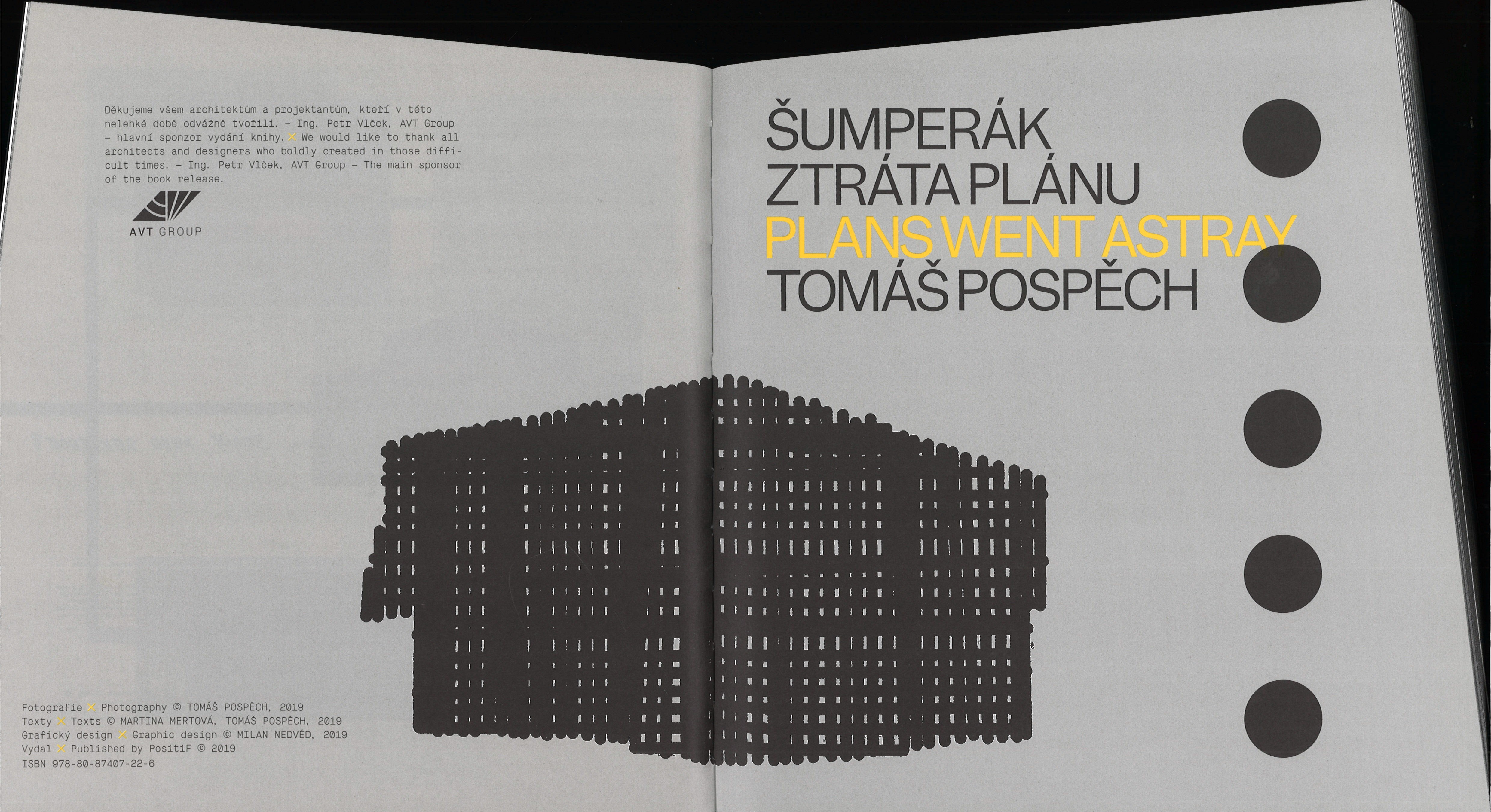 Názvové údaje Šumperák : ztráta plánu = plans went astray / Tomáš Pospěch ; koncepce projektu a fotografie Tomáš Pospěch ; texty Martina Mertová, Tomáš Pospěch ; grafický design Milan Nedvěd ; překlad do angličtiny Elizabeth Walsh-Spacilova Osobní jméno Pospěch, Tomáš, 1974- (Autor) (Autor koncepce) (Fotograf) Další autoři Mertová, Martina, 1978- (Autor) Nedvěd, Milan, 1978- (Knižní grafik) (Sazeč) Walsh-Spáčilová, Elizabeth, 1970- (Překladatel) Korp. Nakladatelství PositiF (Nakladatel, vydavatel) Tiskárna Helbich (Tiskař) Nakladatel Praha : Positif, [2019] Výrobce [Brno] : Tiskárna Helbich, a.s. Copyright ©2019 Rozsah 271 stran : ilustrace (převážně barevné), plány, faksimile ; 22 x 23 cm ISBN 978-80-87407-22-6 (vázáno) Země vyd. Česko Jazyk dok. čeština * angličtina Jazyk orig. čeština Poznámky Částečně tištěno zvratmo a napříč. - Šedá kartonová vazba (lichoběžník) graficky zdobená, kulaté průřezy, dvoubarevný text (i na hřbetu). - Černé předsádky. - Úvodní stránky s typy a popisy jednotlivých domů (černobílé a barevné fotografie, kresby). - Rozložený šedý titulní list (poděkování, ilustrace, dvoubarevný text, copyrighty). - Obsah. - Pohledy, plánky, nákresy, černobílé a barevné fotografie s popisky (do s. 135). - Zvratmo tištěná část (barevné fotografie s popisky do s. 265). - Text, poděkování, tiráž. - Na zadní straně vazby anotace knihy.