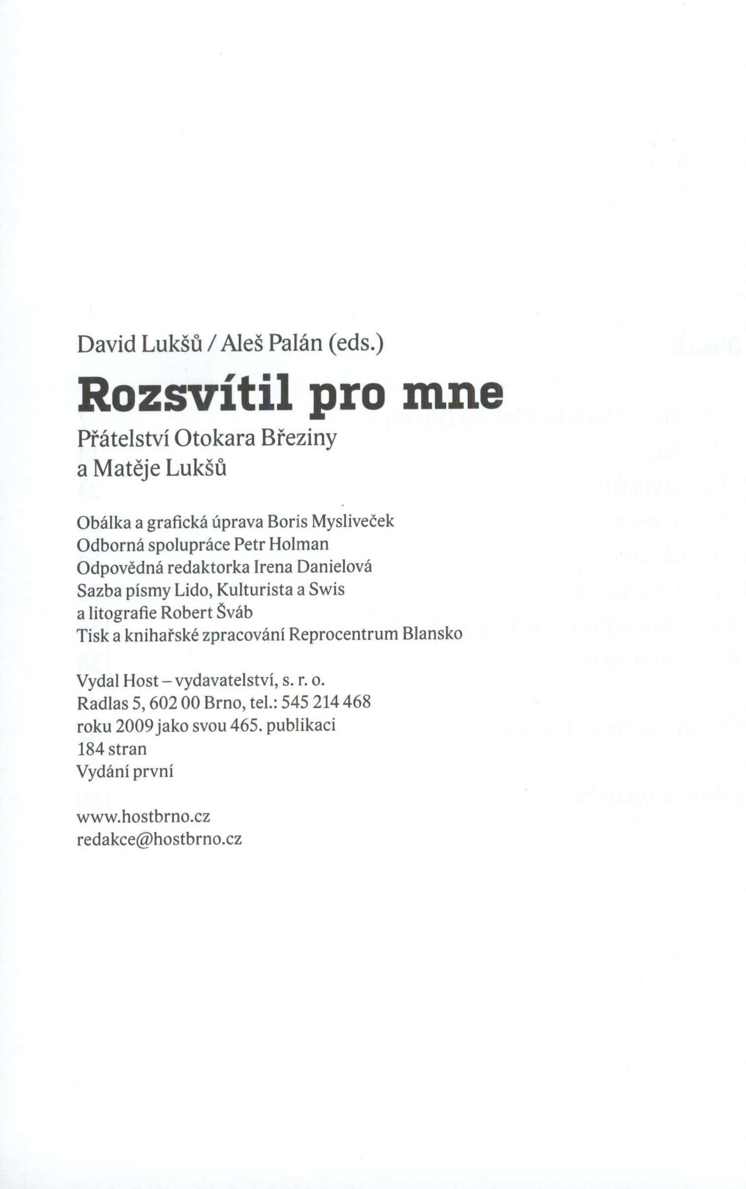 Názvové údaje Rozsvítil pro mne : přátelství Otokara Březiny a Matěje Lukšů / David Lukšů, Aleš Palán (eds.) ; obálka a grafická úprava Boris Mysliveček Osobní jméno Březina, Otokar, 1868-1929 (Autor) (Korespondent) Další autoři Lukšů, Matěj, 1868-1931 (Autor) (Korespondent) Lukšů, David, 1979- (Editor) Palán, Aleš, 1965- (Editor) Mysliveček, Boris, 1948- (Autor obálky) (Knižní grafik) Korp. Host (nakladatelství) (Nakladatel, vydavatel) Tiskárna Reprocentrum (Tiskař) Údaje o vydání Vydání první Nakladatel Brno : Host, 2009 Výrobce Blansko : Reprocentrum Rozsah 180 stran : ilustrace, portréty, faksimile ; 21 cm ISBN 978-80-7294-358-6 (brožováno) Země vyd. Česko Jazyk dok. čeština Poznámky Zdobená barevná obálka. - V prelimináriích a na začátku jednotlivých kapitol černobílé faksimile originálních deníků Matěje Lukšů. - Frontispis. - Černobílé fotografie, portréty a faksimile, převážně s popiskami. - Ediční poznámka. - Obsah. - Na zadní straně obálky anotace knihy a stručná biografická poznámka o editorech.