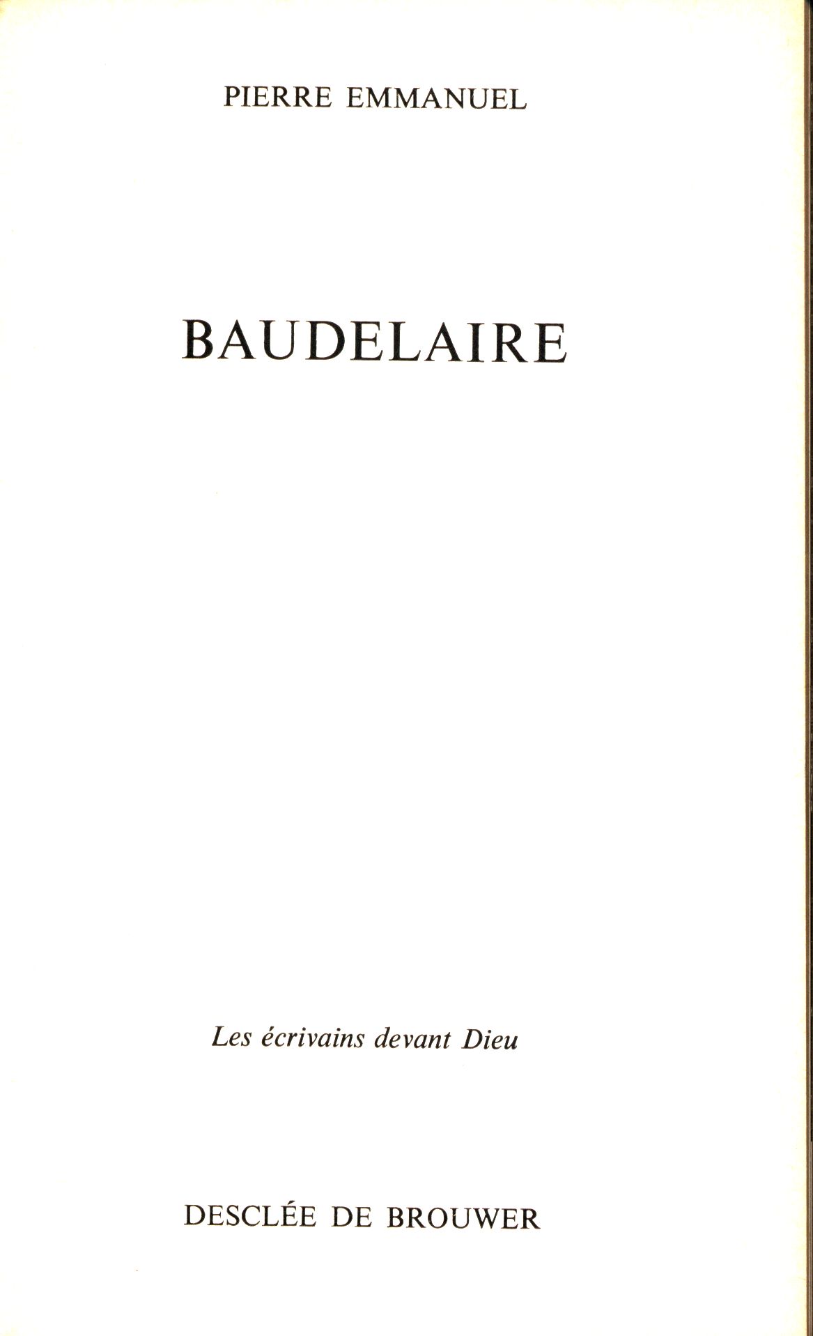 Názvové údaje Baudelaire / Pierre Emmanuel Osobní jméno Emmanuel, Pierre, 1916-1984 (Autor) Další autoři Desclée de Brouwer (firma) (Nakladatel, vydavatel) Société de Saint-Augustin - Desclée de Brouwer & C-ie (nakladatelství a vydavatelství) (Tiskař) Nakladatel [místo vydání neuvedeno] : Desclée de Brouwer, 1967 Výrobce [místo neuvedeno] : Imprimerie Saint-Augustin Rozsah 151 stran, 4 listy obrazové přílohy : ilustrace ; 17 cm ISBN (brožováno) Edice Écrivains devant Dieu ; 11