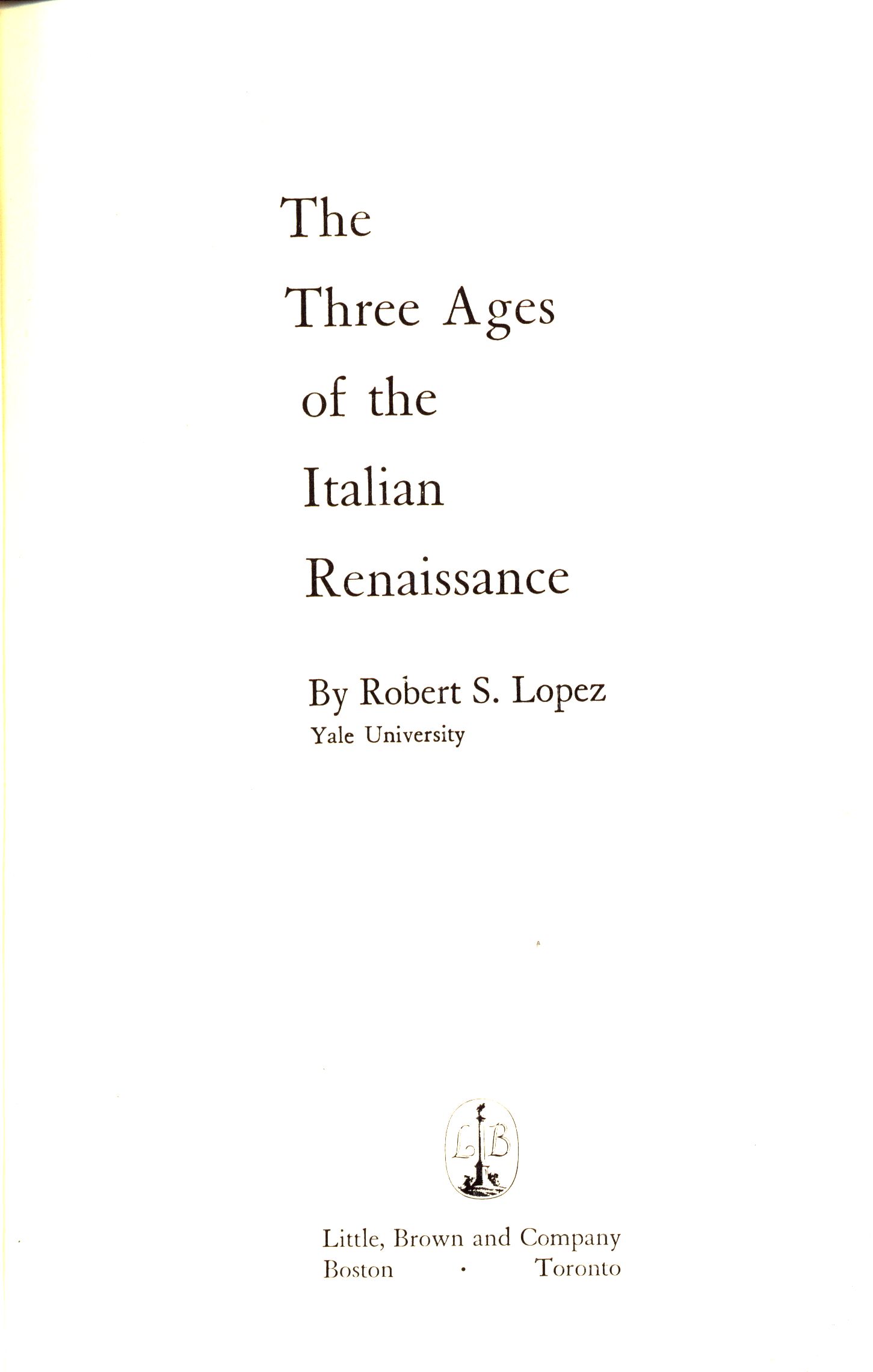 Názvové údaje The Three Ages of the Italian Renaissance / by Robert S. Lopez Osobní jméno Lopez, Roberto S. (Robert Sabatino), 1910-1986 (Autor) Další autoři Little, Brown and Company (nakladatelství) (Nakladatel, vydavatel) Nakladatel Boston ; Toronto : Little, Brown and Company, 1970 Rozsah VI, 103 stran, 24 stran obrazové přílohy : ilustrace ; 19 cm ISBN (brožováno) Země vyd. Spojené státy americké Jazyk dok. angličtina Poznámky Barevná zdobená obálka. - Ilustrace. - Poznámky. - Rejstřík. - Na zadní straně obálky anotace.