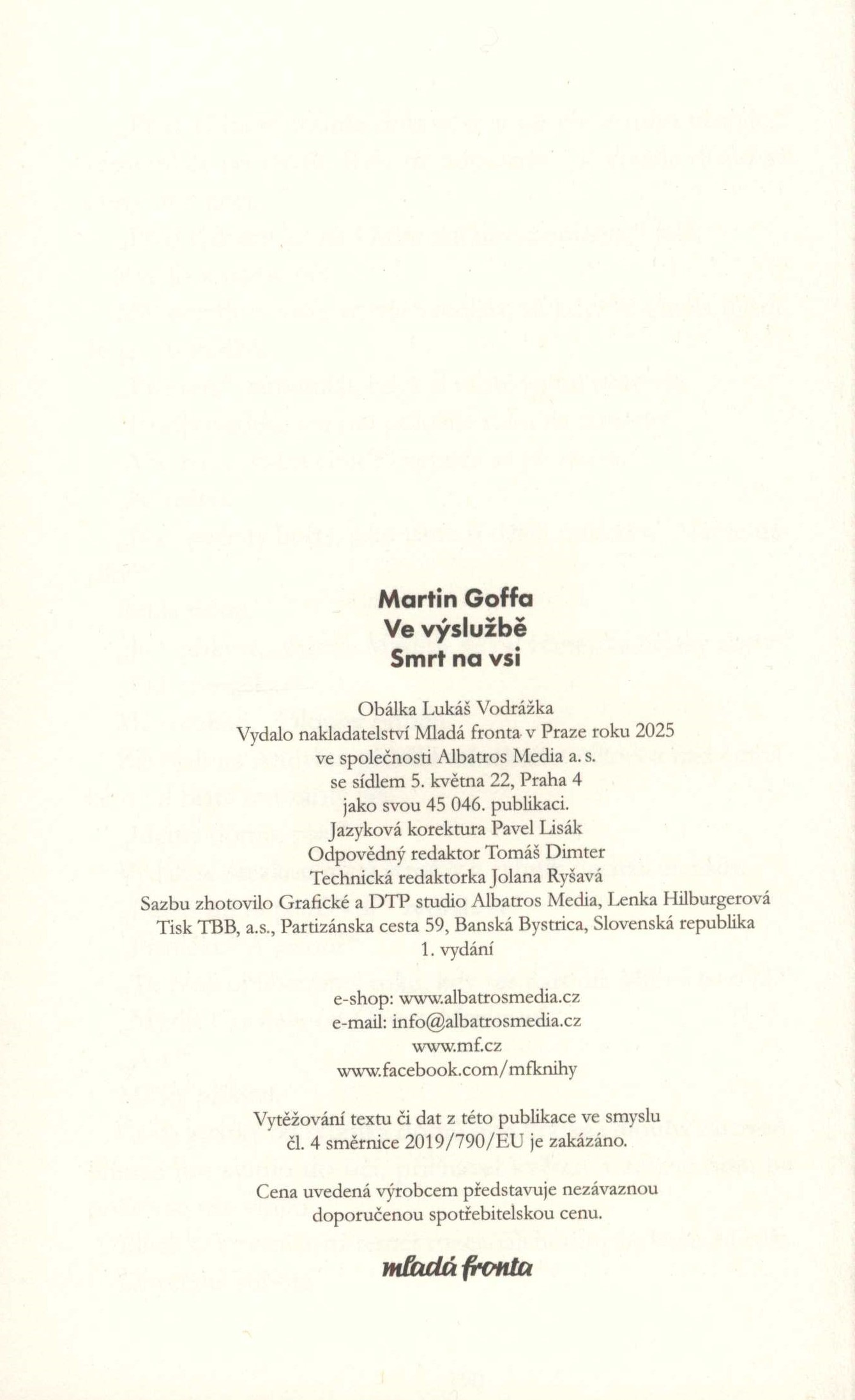 Názvové údaje Ve výslužbě. Smrt na vsi / Martin Goffa ; obálka Lukáš vodrážka Osobní jméno Goffa, Martin, 1973- (Autor) Další autoři Vodrážka, Lukáš (Autor obálky) Korp. Mladá fronta (nakladatelství) (Nakladatel, vydavatel) Tlačiareň BB (tiskárna) (Tiskař) Údaje o vydání 1. vydání Nakladatel V Praze : Mladá fronta, 2025 Výrobce Banská Bystrica : TBB, a.s. Rozsah 190 stran ; 21 cm ISBN 978-80-204-6432-3 (vázáno) Země vyd. Česko Jazyk dok. čeština Poznámky Zdobená barevná obálka. - Na zadní straně obálky recenze a anotace knihy.