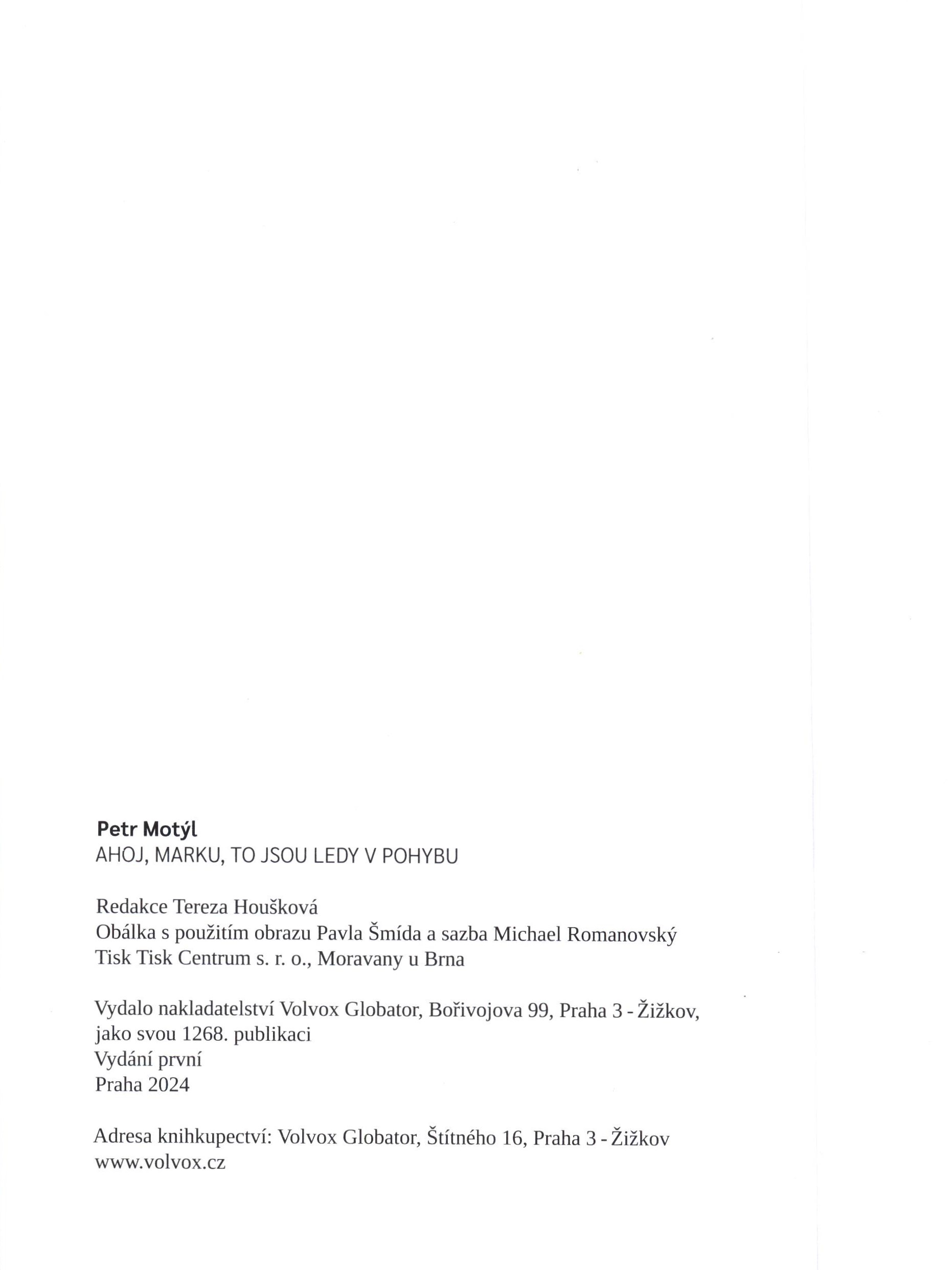 1. Názvové údajeAhoj, Marku, to jsou ledy v pohybu / Petr Motýl ; obálka s použitím obrazu Pavla Šmída a sazba Michael Romanovský