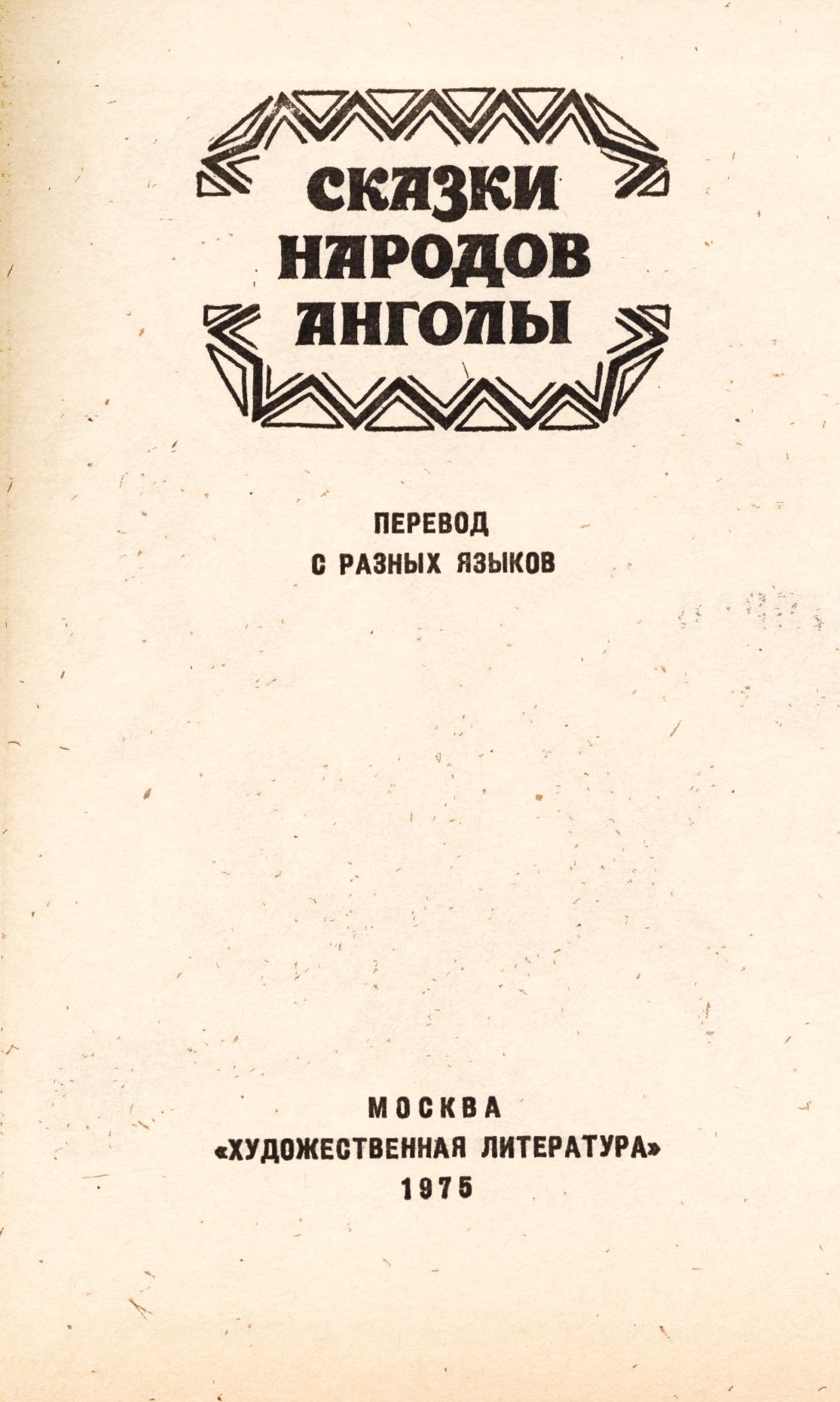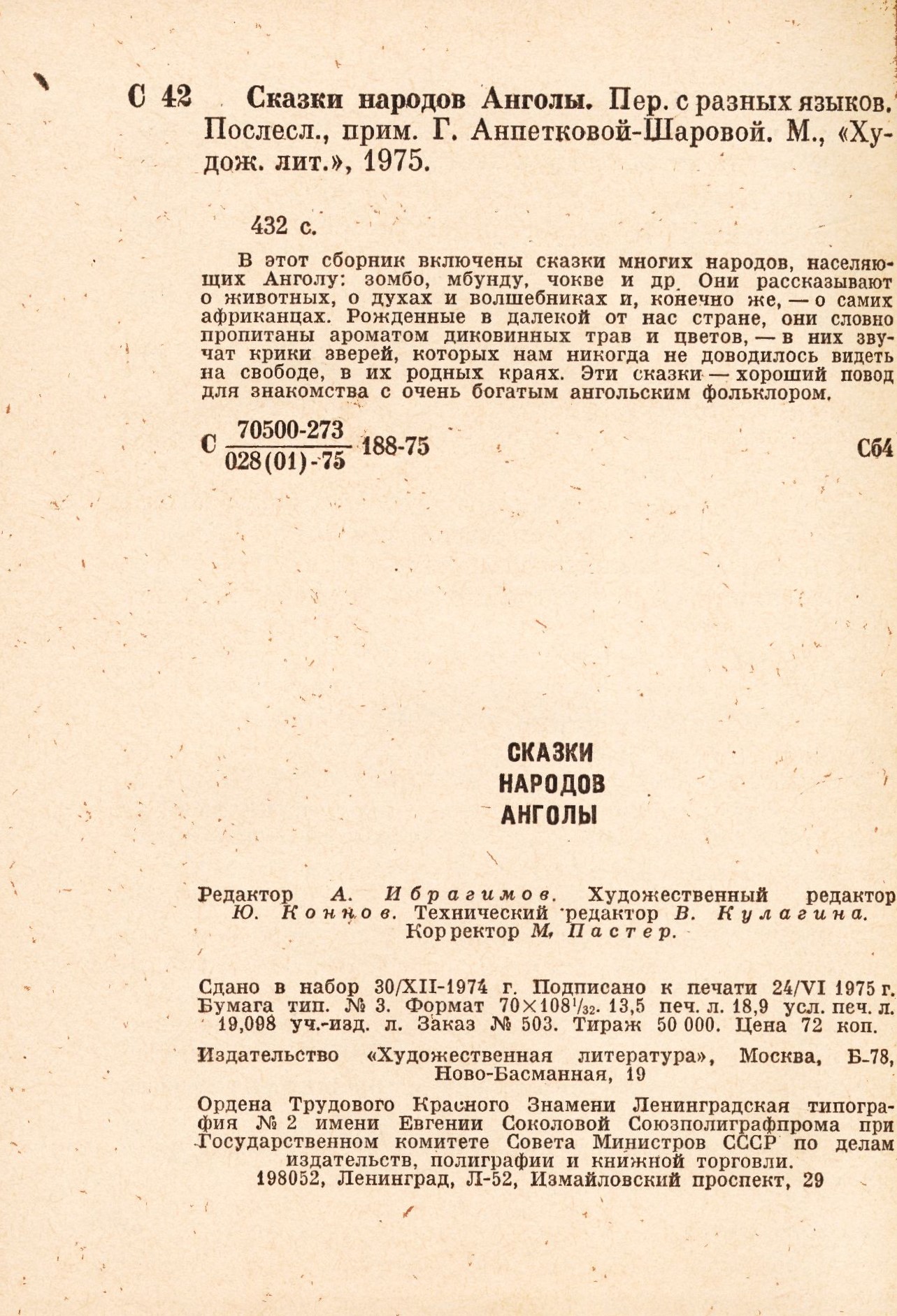Názvové údaje Skazki narodov Angoly : perevod s raznych jazykov Další autoři Chudožestvennaja literatura (nakladatelství) (Nakladatel, vydavatel) Nakladatel Moskva : Chudožestvennaja literatura, 1975 Rozsah 430 stran : černobílé ilustrace ; 17 cm ISBN (vázáno) Země vyd. Rusko Jazyk dok. ruština Jazyk orig. více jazyků Poznámky Plátěná obálka s barevnou ražbou. - Zdobené předsádky. - Ilustrovaný frontispice. - Titulní list zdobený ornamentem. - Černobílé ilustrace. - Obsah. - Tiráž.