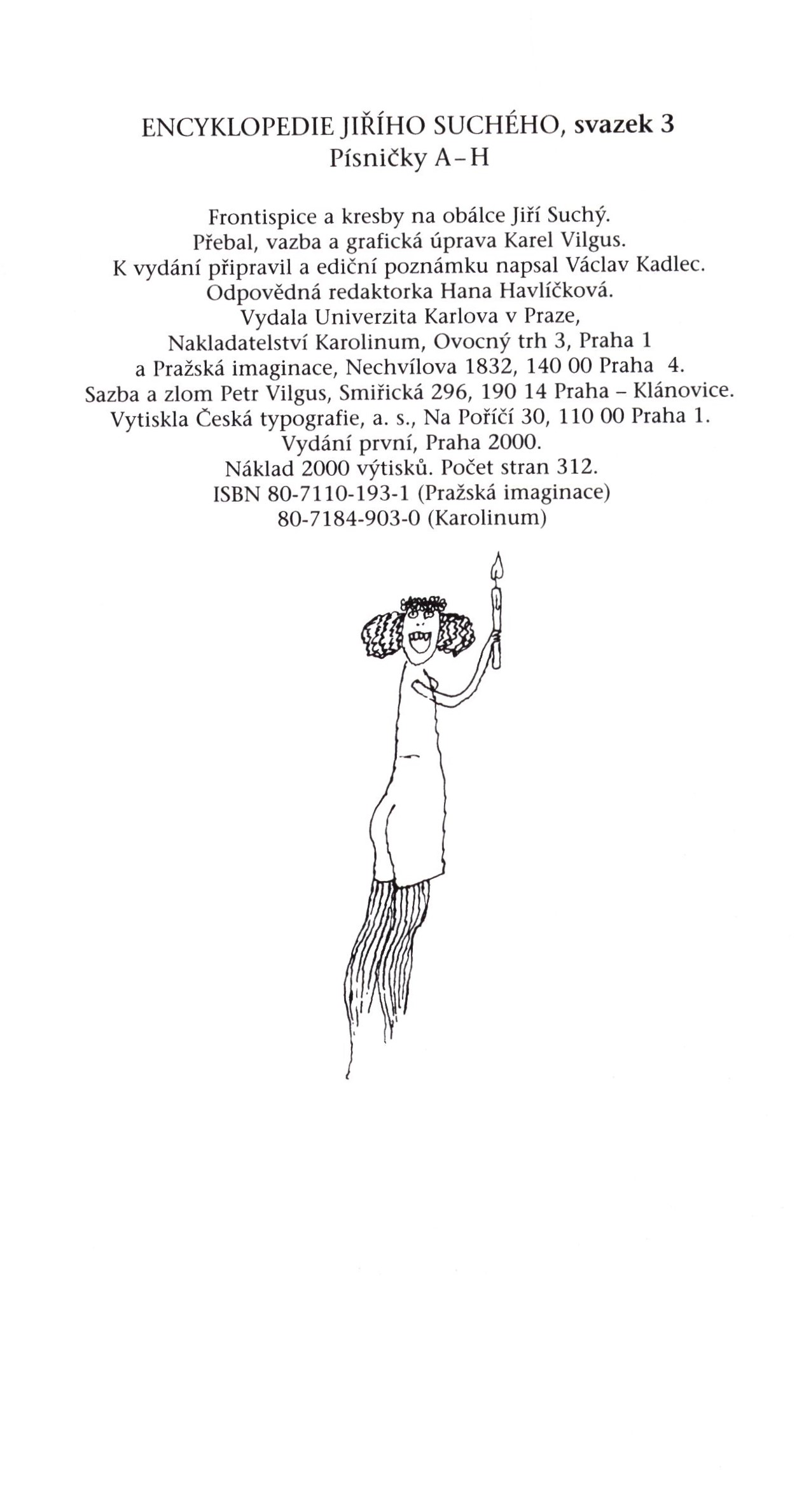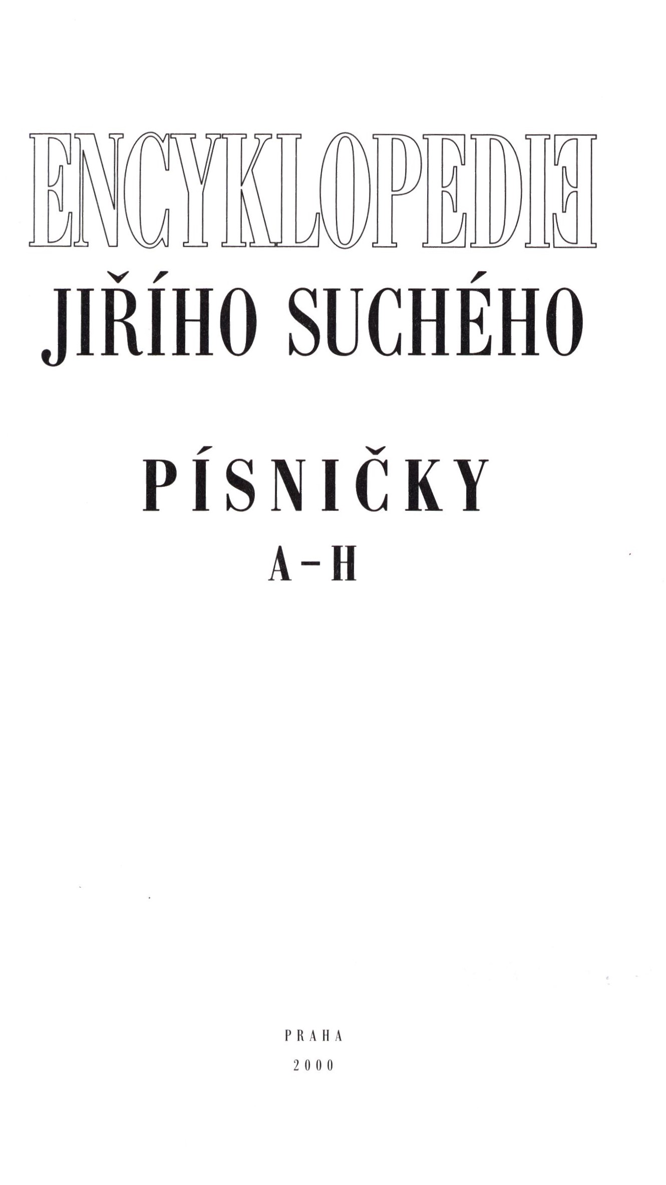 1. Názvové údajeEncyklopedie Jiřího Suchého. svazek 3, Písničky A-H / Jiří Suchý ; frontispice a kresby na obálce Jiří Suchý ; přebal, vazba a grafická úprava Karel Vilgus ; k vydání připravil a ediční poznámku napsal Václav Kadlec