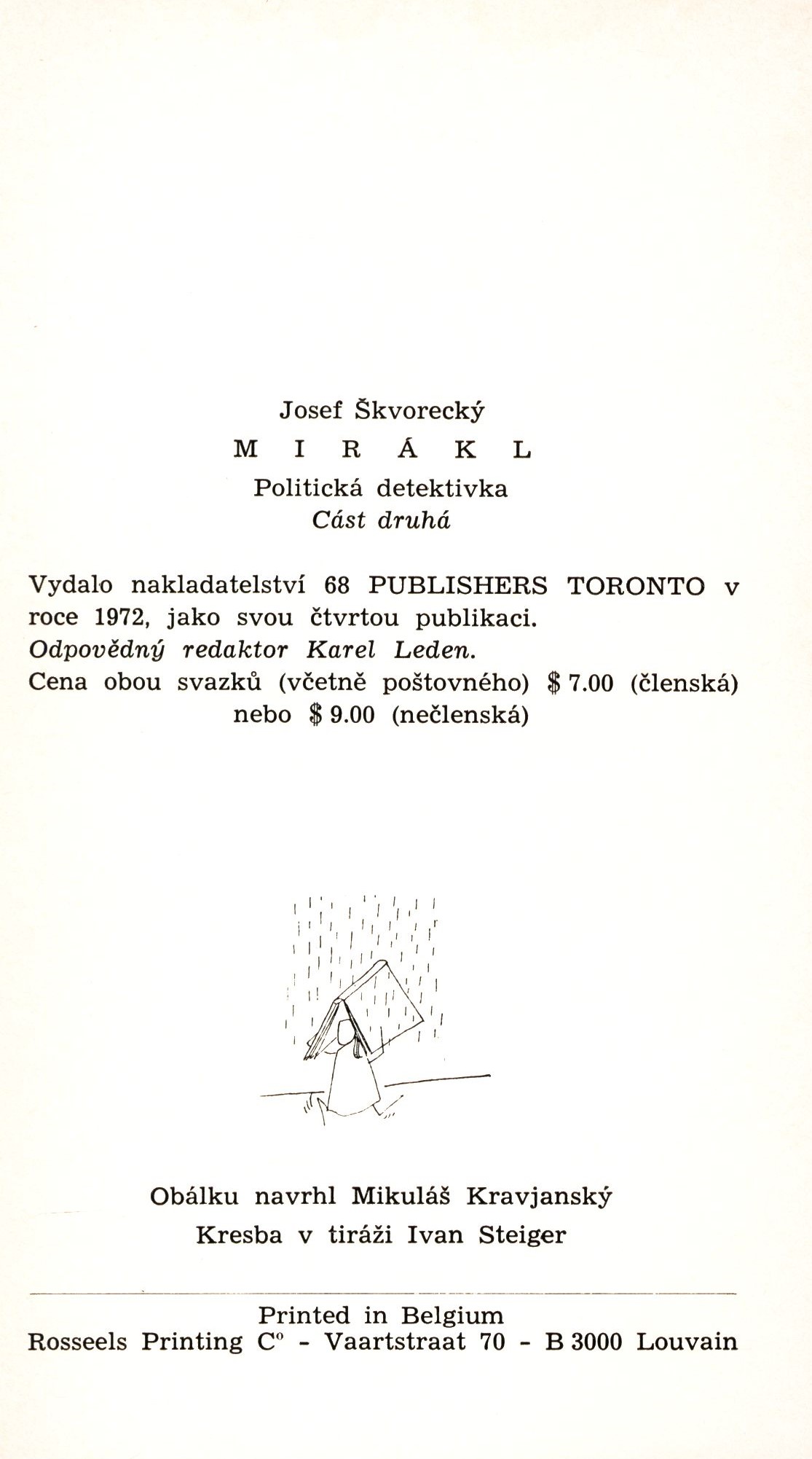 Názvové údaje Mirákl : politická detektivka. [1.] / Josef Škvorecký ; obálku navrhl Mikuláš Kravjanský ; kresba v tiráži Ivan Steiger Osobní jméno Škvorecký, Josef, 1924-2012 (Autor) Další autoři Kravjanský, Mikuláš, 1928- (Autor obálky) Steiger, Ivan, 1939-2025 (Ilustrátor) Korp. Sixty-Eight Publishers (exilové nakladatelství) (Nakladatel, vydavatel) Nakladatel Toronto : 68 Publishers, 1972 Výrobce Printed in Belgium : Rosseels Printing Co. Rozsah 297 stran ; 18 cm ISBN (brožováno) Země vyd. Kanada Jazyk dok. čeština Poznámky Ilustrovaná obálka. - Titulní list s nakladatelským signetem. - Obsah. - Tiráž. - Portrétní fotografie autora na zadní straně obálky.