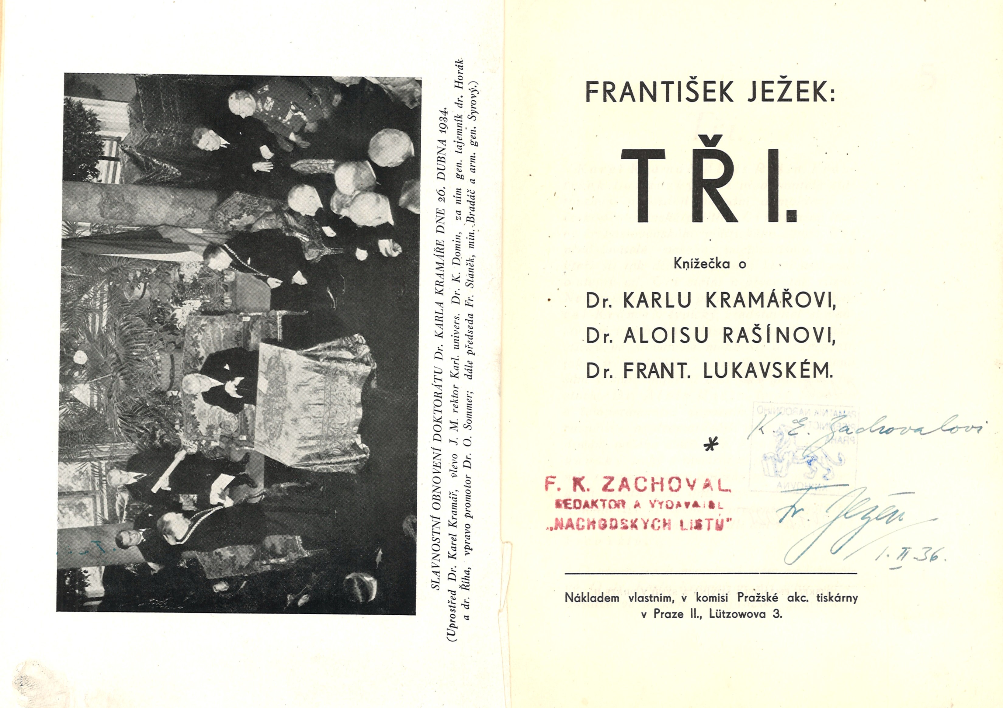 Názvové údaje Tři : knížečka o Dr. Karlu Kramářovi, Dr. Aloisu Rašínovi, Dr. Frant. Lukavském / František Ježek Osobní jméno Ježek, František, 1890-1969 (Autor) (Nakladatel, vydavatel) Další autoři Pražská akciová tiskárna (Distributor) Emanuel Stivín (v Praze) (Tiskař) Nakladatel [V Praze] : nákladem vlastním, [1936] Distributor V komisi Pražské akc. tiskárny Výrobce Tiskem Emanuela Stivína a synů Rozsah 65 stran, 3 listy obrazových příloh : ilustrace, portréty ; 22 cm ISBN (Brožováno) Země vyd. Česko Jazyk dok. čeština Poznámky Barevná zdobená obálka s fotoportréty osobností. - Frontispis s fotografií. - Na přílohách černobílé fotografie. - V závěru knihy reklamy, 18 stran včetně 3. a 4. strany obálky. - Datum vydání dle SKC NK.