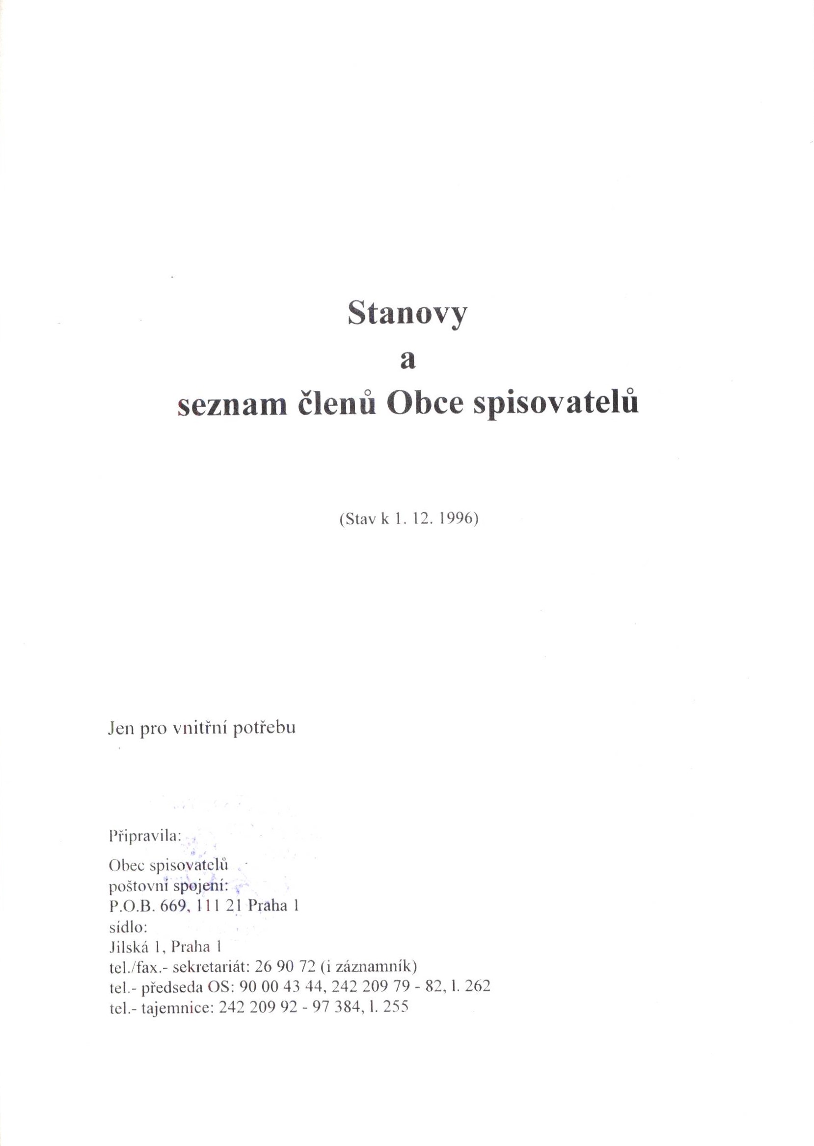 Názvové údaje Stanovy a seznam členů Obce spisovatelů : stav k 1.12.1996 / připravila Obec spisovatelů Záhlaví-korpor. Obec spisovatelů (profesní organizace) (Autor) Nakladatel Praha : Obec spisovatelů, [1996] Rozsah 32 stran ; 21 cm ISBN (Brožováno) Země vyd. Česko Jazyk dok. čeština Poznámky Obsahuje stanovy a abecední seznam členů Obce spisovatelů. - Jen pro vnitřní potřebu.