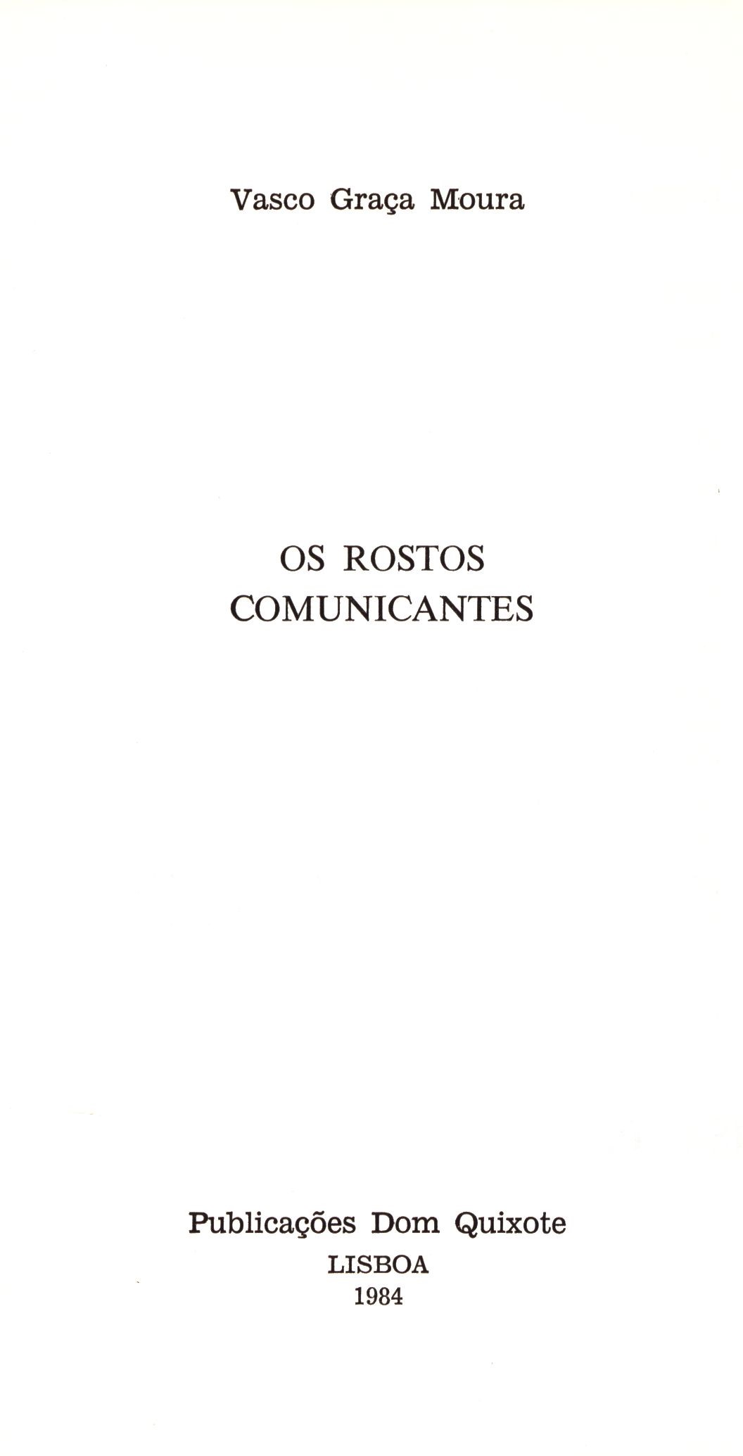 Názvové údaje Os rostos comunicantes / Vasco Graça Moura Osobní jméno Moura, Vasco Graça, 1942-2014 (Autor) Další autoři Publicações Dom Quixote (Nakladatel, vydavatel) Údaje o vydání 1ª edição Nakladatel Lisboa : Publicações Dom Quixote, 1984 Výrobce Gráfica Maiadouro Rozsah 58 stran ; 18 cm ISBN (brožováno) Edice Cadernos de poesia ; No. 28