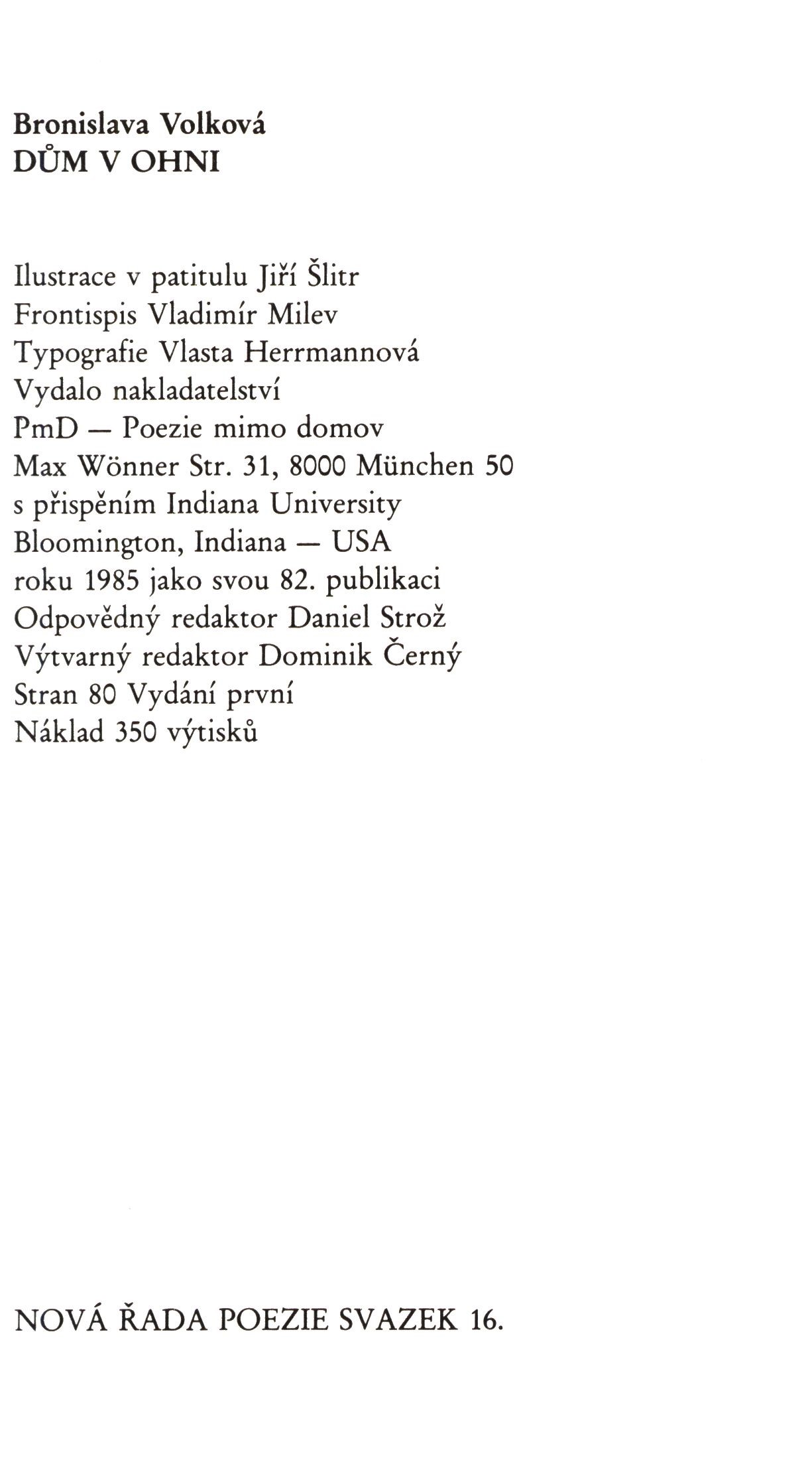 Nová řada poezie, (Poezie mimo domov)Země vyd. Německo Jazyk dok. čeština Poznámky Červená obálka. - Titulní list. - Černobílá ilustrace. - Obsah. - Tiráž.