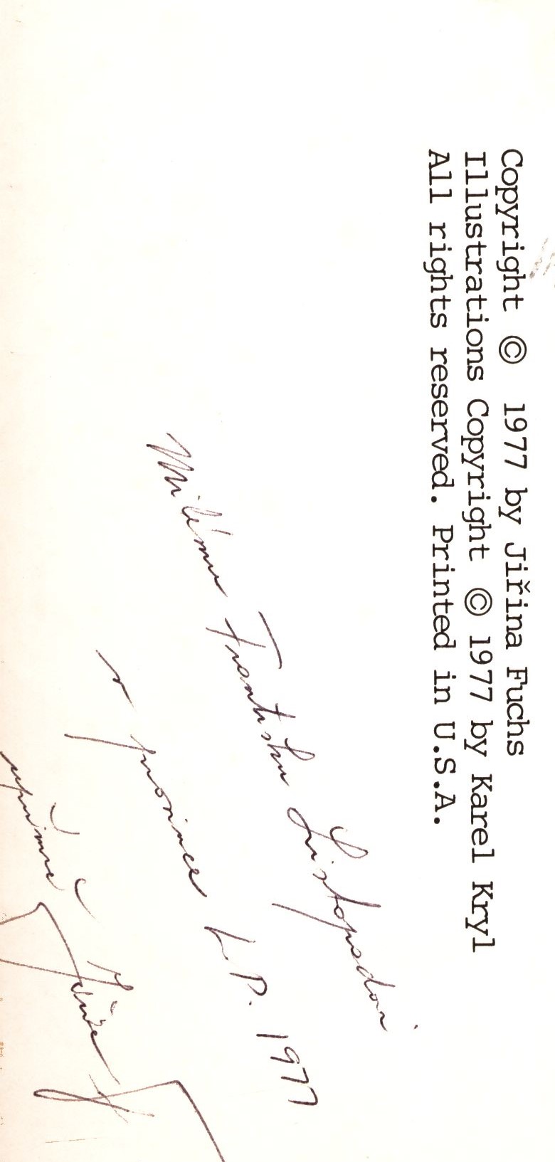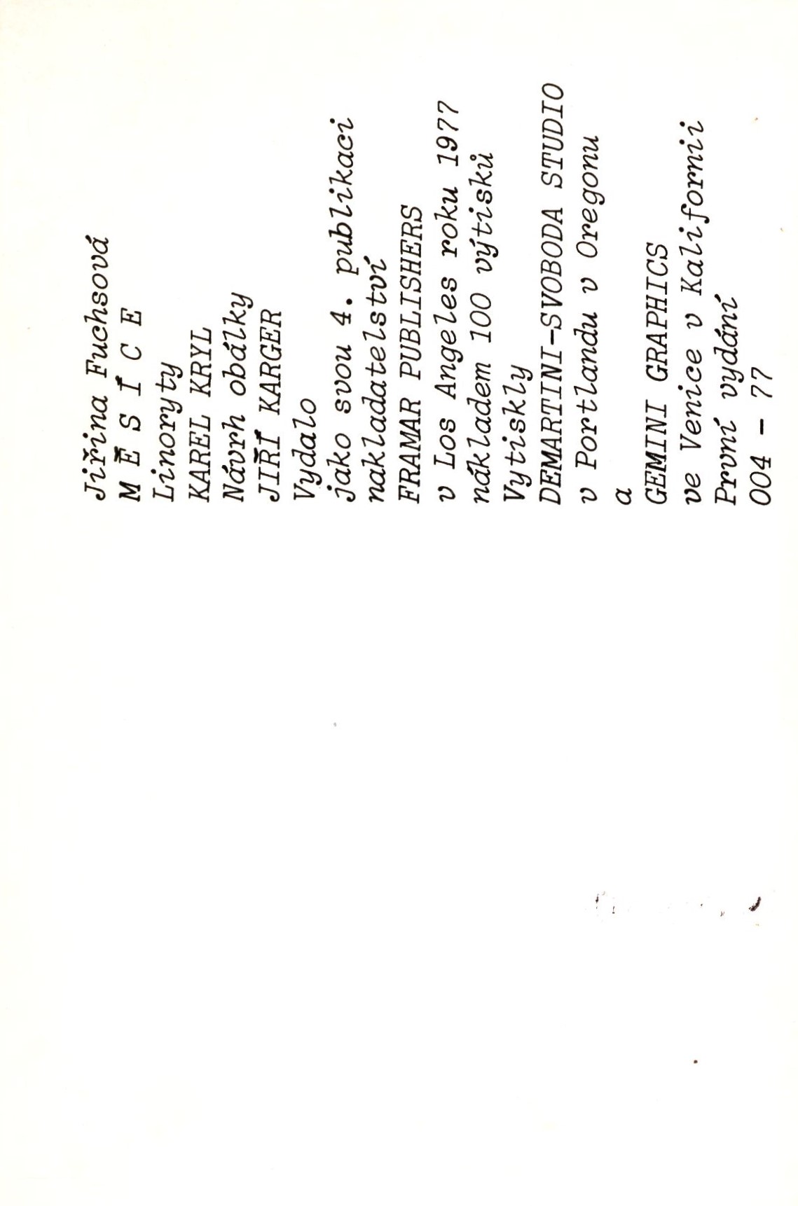 Názvové údaje Měsíce / Jiřina Fuchsová ; linoryty Karel Kryl ; návrh obálky Jiří Karger Osobní jméno Fuchsová, Jiřina, 1943- (Autor) (Dedikátor) Další autoři Kryl, Karel, 1944-1994 (Ilustrátor) Karger, Jiří, 1924-2010 (Autor obálky) Listopad, František, 1921-2017 (Dedikant) Korp. Framar Publishers (Nakladatel, vydavatel) Údaje o vydání První vydání Nakladatel Los Angeles : Framar Publishers, 1977 Výrobce Portland v Oregonu a Venice v Kalifornii : Demartini-Svoboda Studio a Gemini Graphics Rozsah 12 dvoulistů v obálce : ilustrace ; 15 cm ISBN (volné dvoulisty) Země vyd. Spojené státy americké Jazyk dok. čeština Poznámky Dvoulisty ve zdobené obálce. - Černobílé linoryty (zdobené iniciály). - Tiráž na zadní záložce obálky.