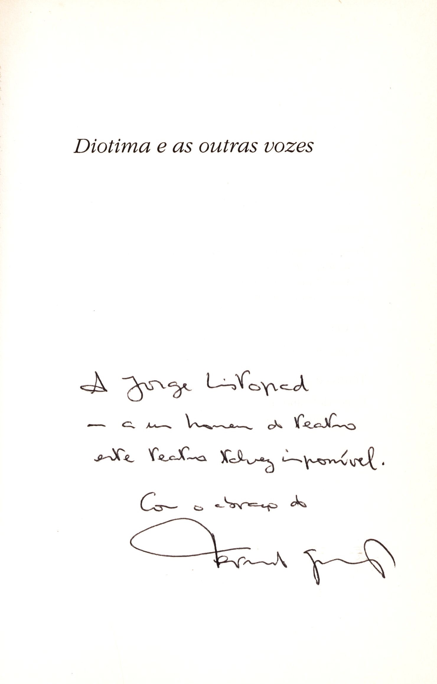 Názvové údaje Diotima e as outras vozes / Fernando Guimarães Osobní jméno Guimarães, Fernando, 1928-2025 (Autor) Další autoři Listopad, František, 1921-2017 (Dedikant) Korp. Campo das Letras, Editores (Nakladatel, vydavatel) Údaje o vydání 1. ediçao Nakladatel Porto : Campo das Letras, 1999 Výrobce Humbertipo Rozsah 153 stran ; 20 cm ISBN 972-610-218-9 (brožováno) Edice Campo do teatro ; 5