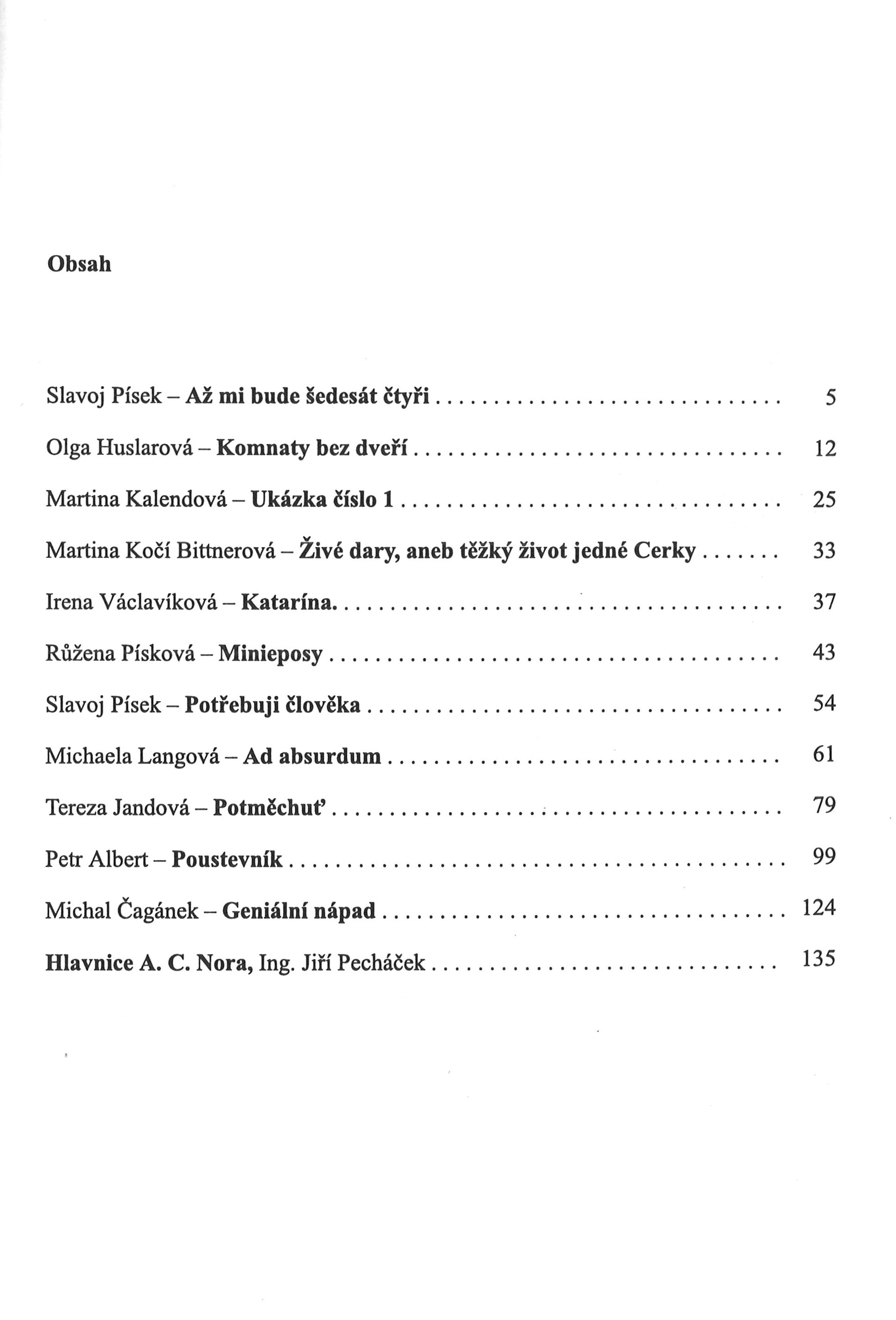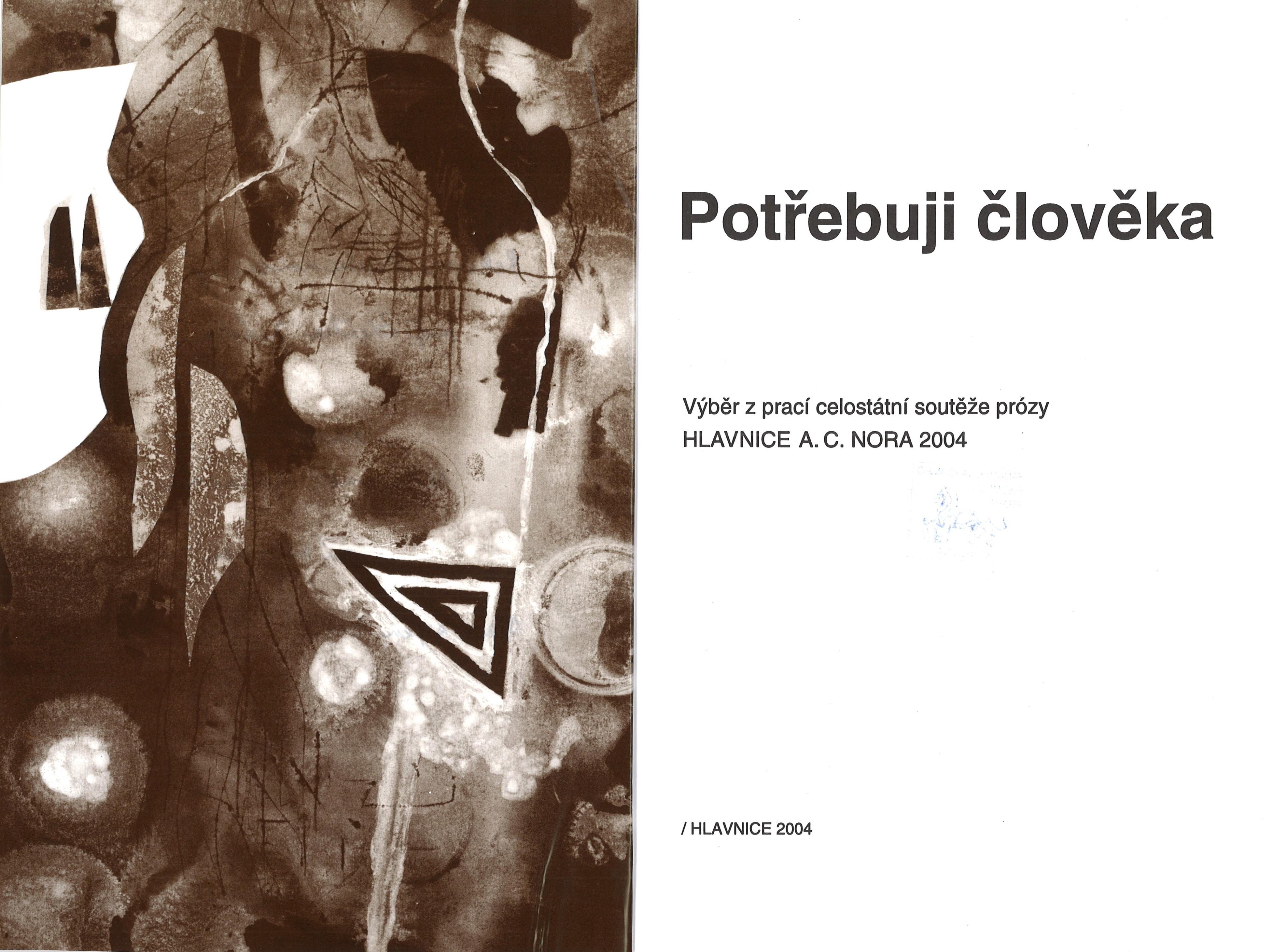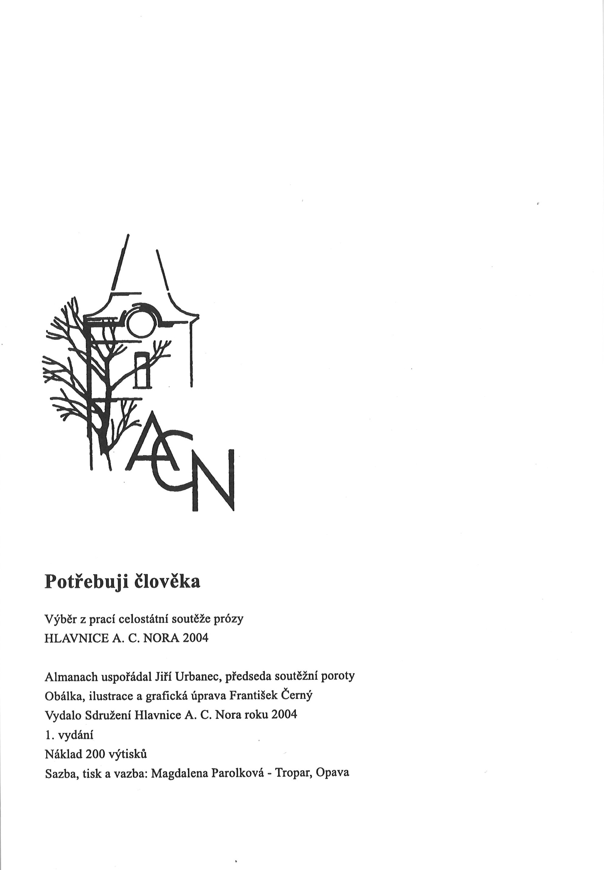 Názvové údaje Potřebuji člověka : výběr z prací celostátní soutěže prózy Hlavnice A.C. Nora 2004 / almanach uspořádal Jiří Urbanec ; obálka, ilustrace a grafická úprava František Černý Záhlaví-akce Hlavnice A.C. Nora (soutěž) (2004 : Česko) Další autoři Urbanec, Jiří, 1932-2014 (Editor) Černý, František, 1936-2007 (Autor obálky) (Ilustrátor) (Knižní grafik) Údaje o vydání 1. vydání Nakladatel Hlavnice : Sdružení Hlavnice A.C. Nora, 2004 Rozsah 140 stran , 4 listy obrazových příloh : ilustrace ; 25 cm ISBN 80-239-4048-1 (v knize neuvedeno ; brožováno) Země vyd. Česko Jazyk dok. čeština Poznámky Zdobená obálka ilustrací Fr. Černého. - Frontispis téhož. - Tónované ilustrace. - Drobná kresba v tiráži. - Medailonky autorů, účastníků literární soutěže. - 200 výtisků