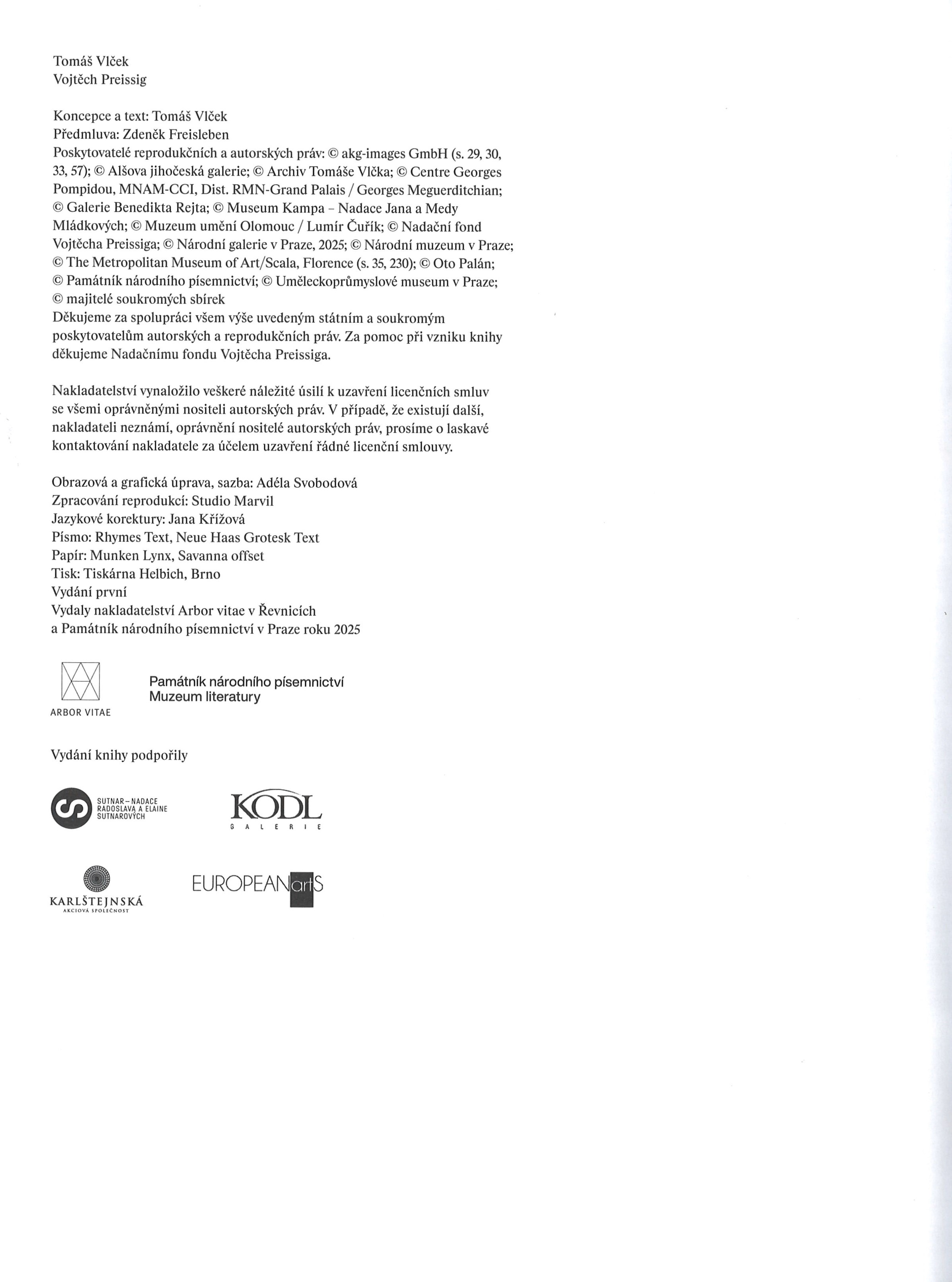 Názvové údaje Vojtěch Preissig / Tomáš Vlček ; předmluva Zdeněk Freisleben ; obrazová a grafická úprava, sazba Adéla Svobodová Osobní jméno Vlček, Tomáš, 1941- (Autor) Další autoři Freisleben, Zdeněk, 1947- (Autor úvodu atd.) Svobodová, Adéla, 1978- (Knižní grafik) (Sazeč) Korp. Arbor vitae (nakladatelství) (Nakladatel, vydavatel) Památník národního písemnictví / Muzeum literatury (Nakladatel, vydavatel) Tiskárna Helbich (Tiskař) Údaje o vydání Vydání první Nakladatel V Praze: Arbor vitae : Památník národního písemnictví, 2025 Výrobce Brno : Tiskárna Helbich Rozsah 358 stran : ilustrace, reprodukce, portréty, faksimile ; 29 cm ISBN 978-80-7467-167-8 (Arbor vitae ; vázáno) 978-80-88503-14-9 (Památník národního písemnictví ; vázáno) Země vyd. Česko Jazyk dok. čeština Poznámky Celoplátěná výpravná vazba zdobená reprodukcí Preissigova obrazu. - Zadní strana vazby rovněž zdobená, přes ni přetažena nakladatelská páska s anotací. - Zdobené předsádky (návrhy tapet). - Frontispis. - Podobizna umělce. - Předmluva. - Barevné reprodukce obrazů a grafik. - Černobílé a tónované fotografie. - Poznámky. - Jmenný rejstřík. - Anglické resumé