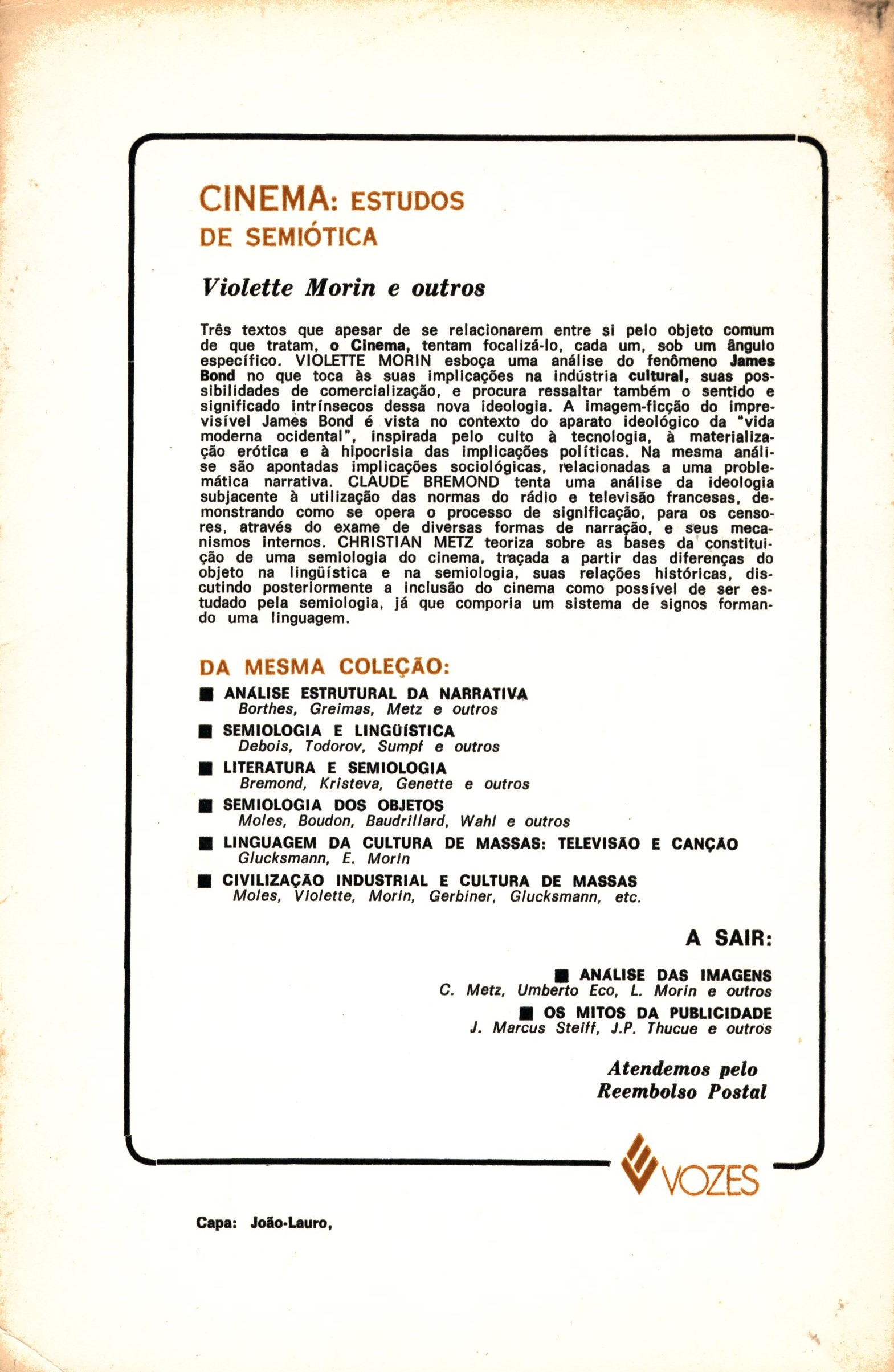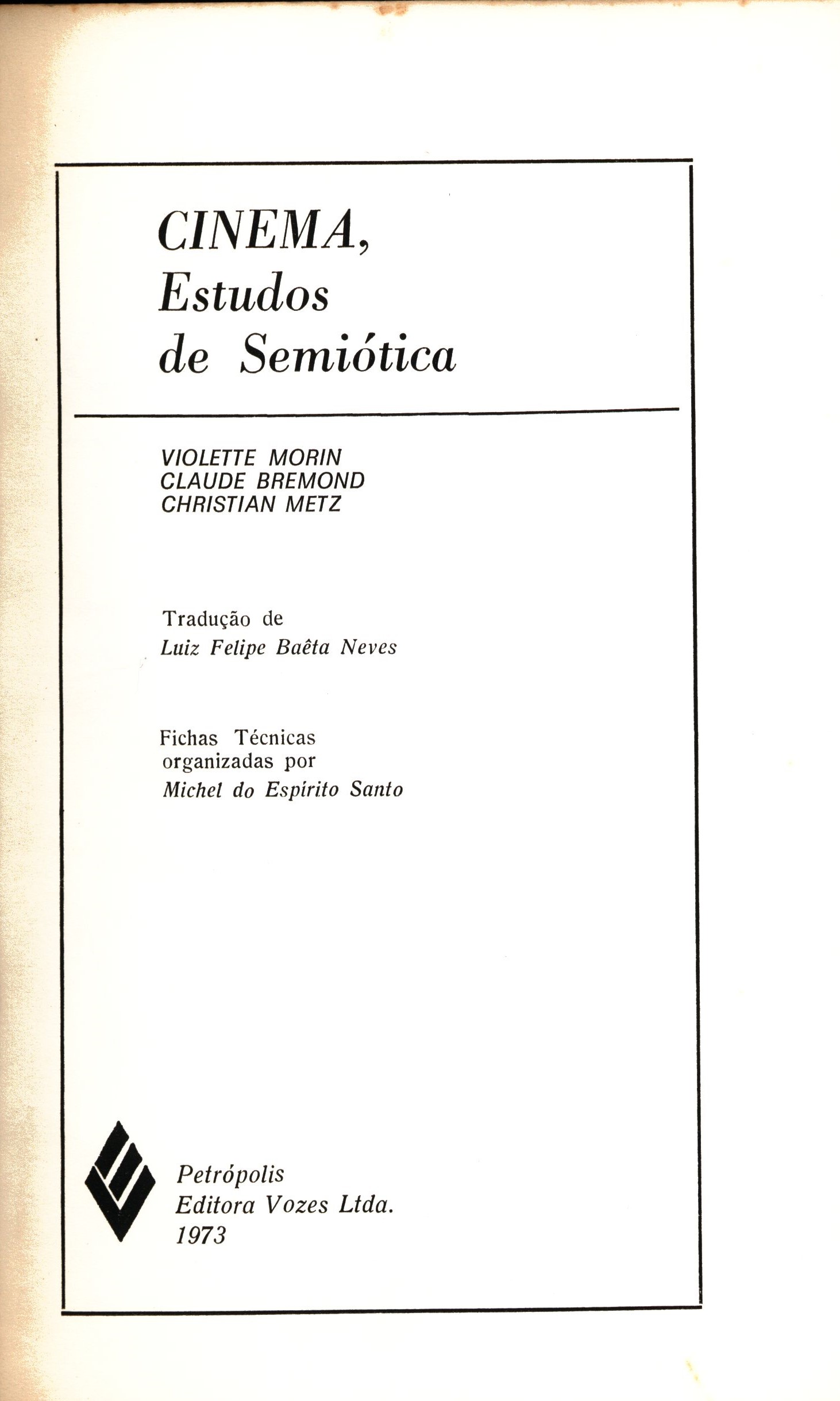 Názvové údaje Cinema, Estudos de Semiótica / Violette Morin ; Claude Bremond ; Christian Metz ; Tradução de Luiz Felipe Baêta Neves ; Fichas Técnicas organizadas por Michel do Espírito Santo Osobní jméno Morin, Violette (Autor) Další autoři Bremond, Claude (Autor) Metz, Christian (Autor) Baêta Neves, Luiz Felipe (Překladatel) do Espírito Santo, Michel (Přispěvatel) Korp. Editora Vozes (Nakladatel, vydavatel) oficinas gráficas da Editora Vozes (Tiskař) Nakladatel Petrópolis : Editora Vozes, 1973 Rozsah 140 stran ; 21 cm ISBN (Vázáno) Země vyd. Brazílie Jazyk dok. portugalština Poznámky Typografická obálka. - Typografický titulní list. - Obsah. - Poznámky pod čarou. - Anotace knihy na zadní obálce.