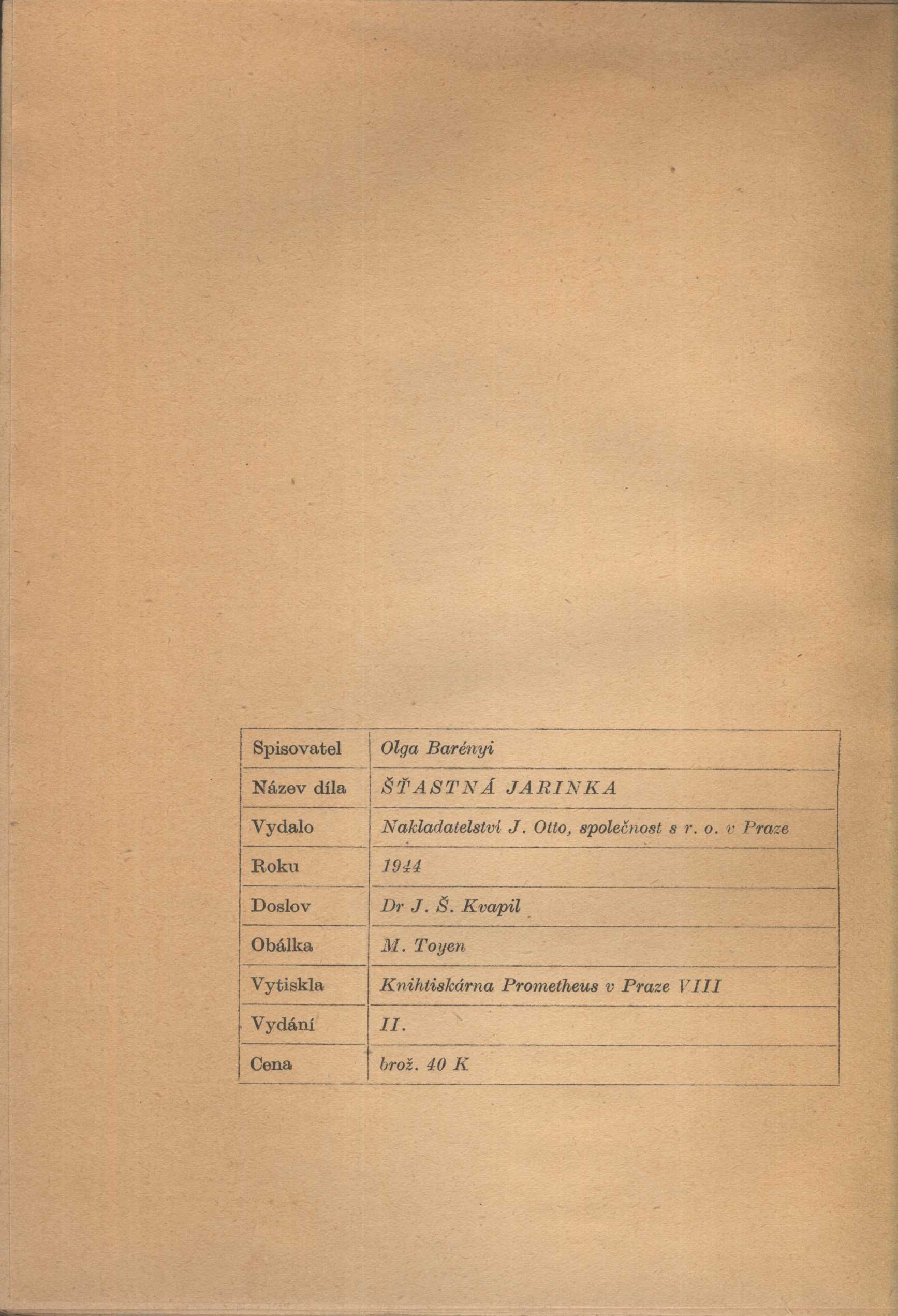 Názvové údaje Šťastná Jarinka / Olga Barényi ; doslov J.Š. Kvapil ; obálka M. Toyen Osobní jméno Barényi, Olga, 1905-1978 (Autor) Další autoři Kvapil, Josef Šofferle, 1904-1975 (Autor doslovu, tiráže atd.) Toyen, 1902-1980 (Autor obálky) Korp. J. Otto (nakladatelství) (Nakladatel, vydavatel) Knihtiskárna Prometheus (Tiskař) Údaje o vydání Vydání II. Nakladatel V Praze : Nakladatelství J. Otto, společnost s r. o., 1944 Výrobce Prometheus Rozsah 97 stran ; 22 cm ISBN (Brožováno) Země vyd. Česko Jazyk dok. čeština Poznámky Obálka zdobená tónovanou ilustrací. - Na záložkách obálky kritické poznámky o 1. vydání knihy